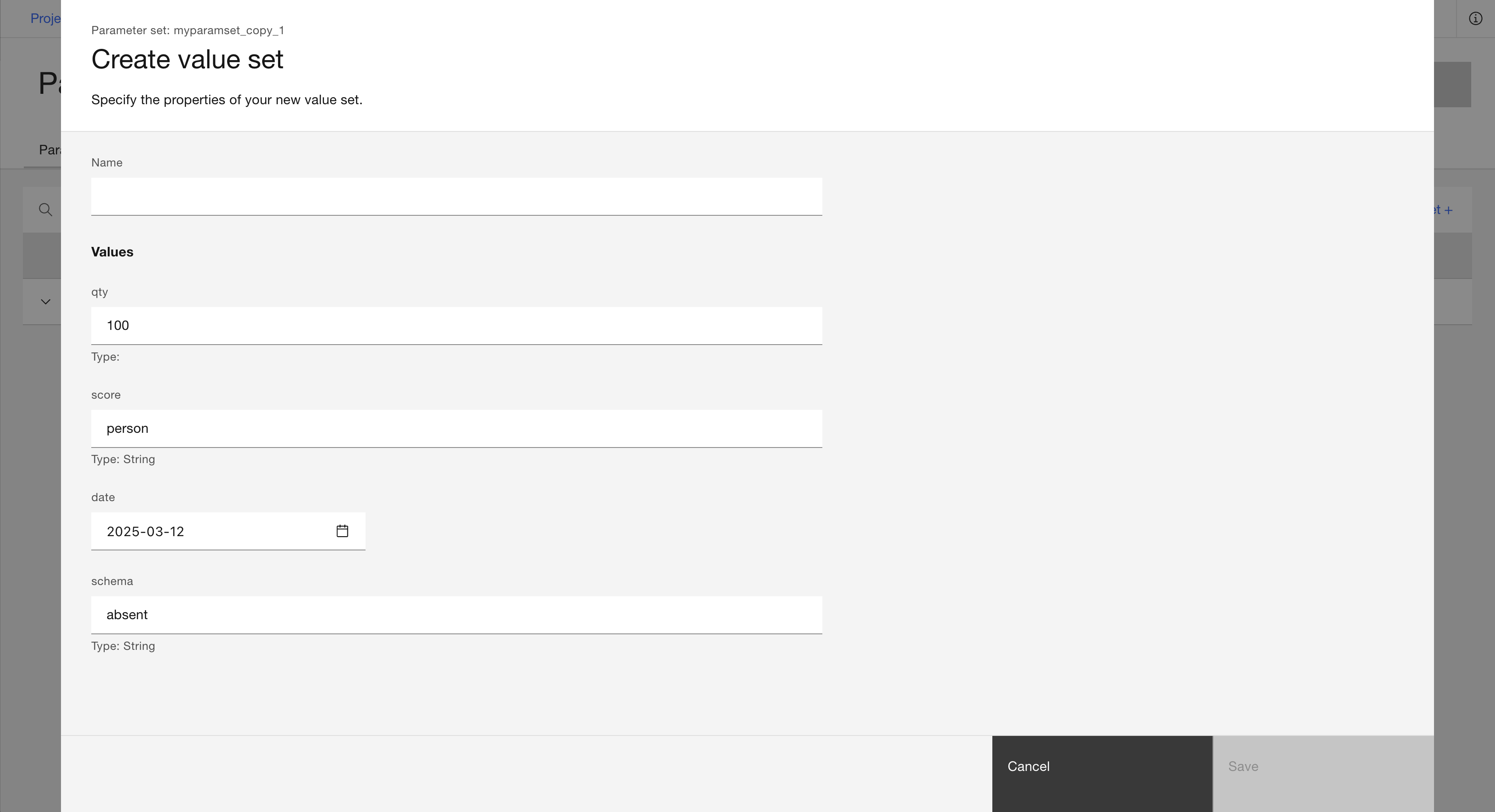 ParameterSet(name='New Paramset Name', parameters=[Parameter(name='qty', param_type='int64', value='100'), Parameter(name='date', param_type='date', value='2025-03-12')], description='', value_sets=[ValueSet(name='set_1', values=[{'name': 'qty', 'value': '20'}, {'name': 'date', 'value': '2025-03-12'}]), ValueSet(name='set_2', values=[{'name': 'qty', 'value': '40'}, {'name': 'date', 'value': '2025-03-12'}])])