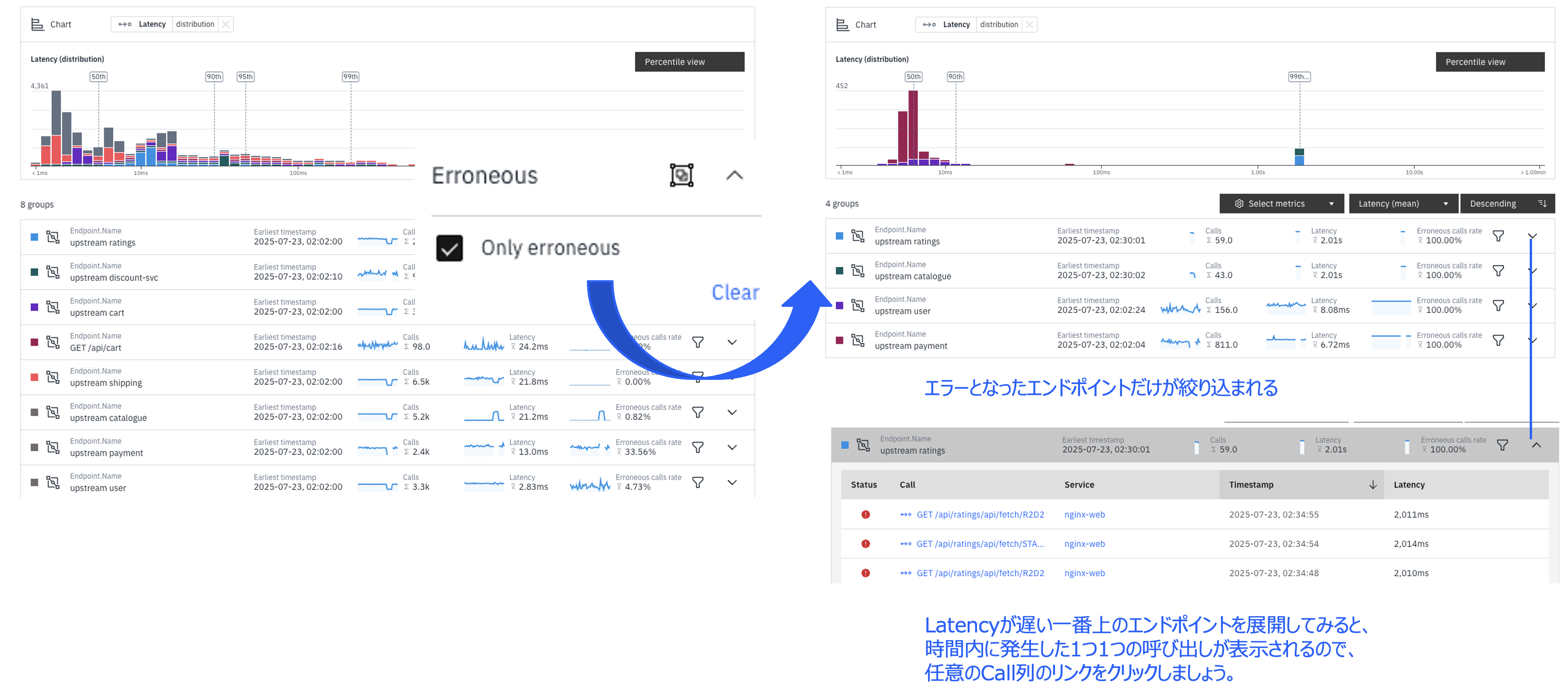 今回はnginx-webでエラーとなった呼び出しを分析したいので、左のメニューから Erroneous > Only erroneous のチェックをONにしましょう。