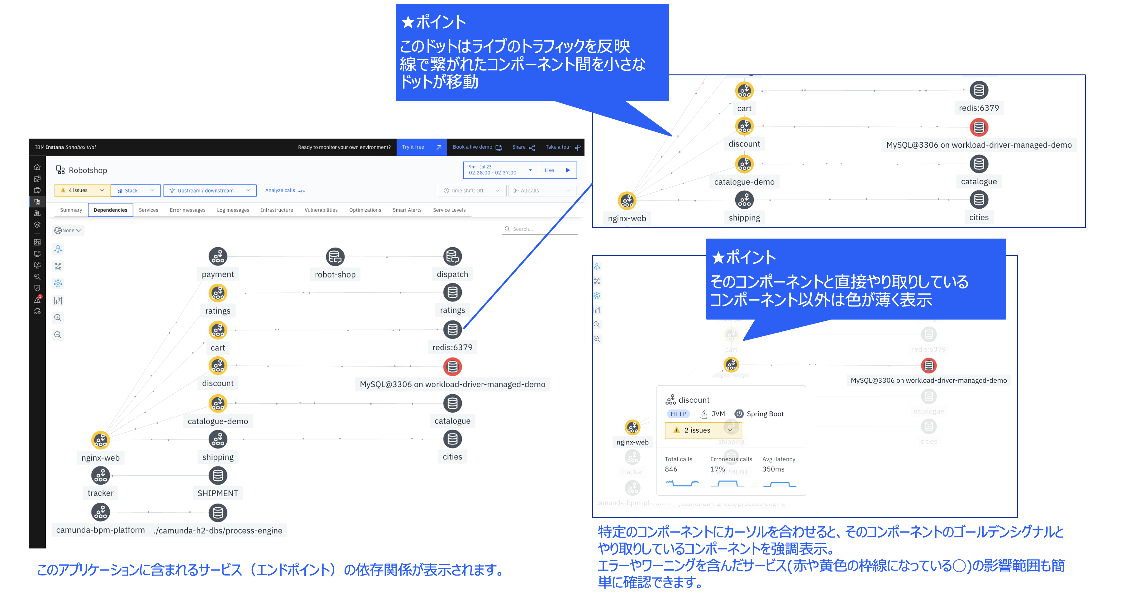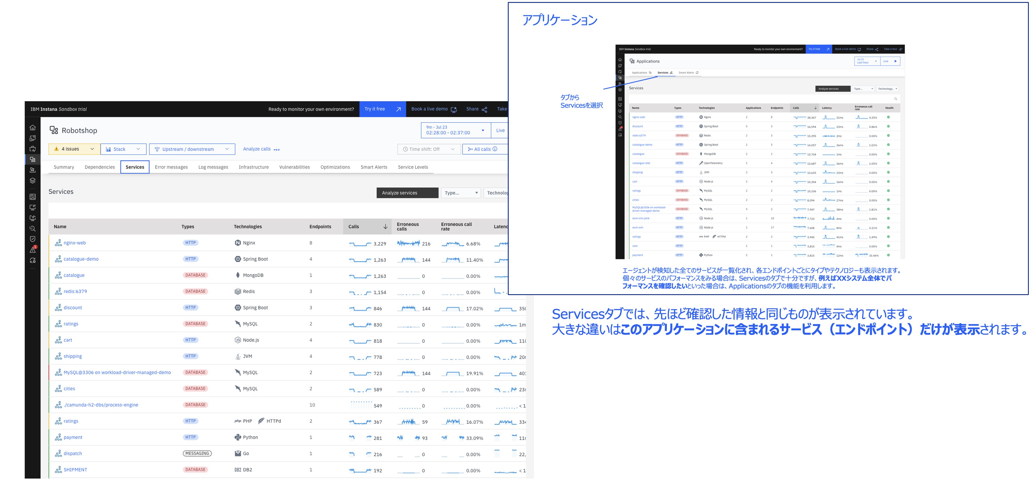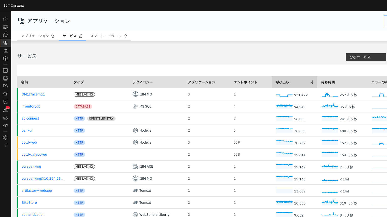 - アプリケーションのモニター: https://www.ibm.com/docs/ja/instana-observability/current?topic=instana-monitoring-applications