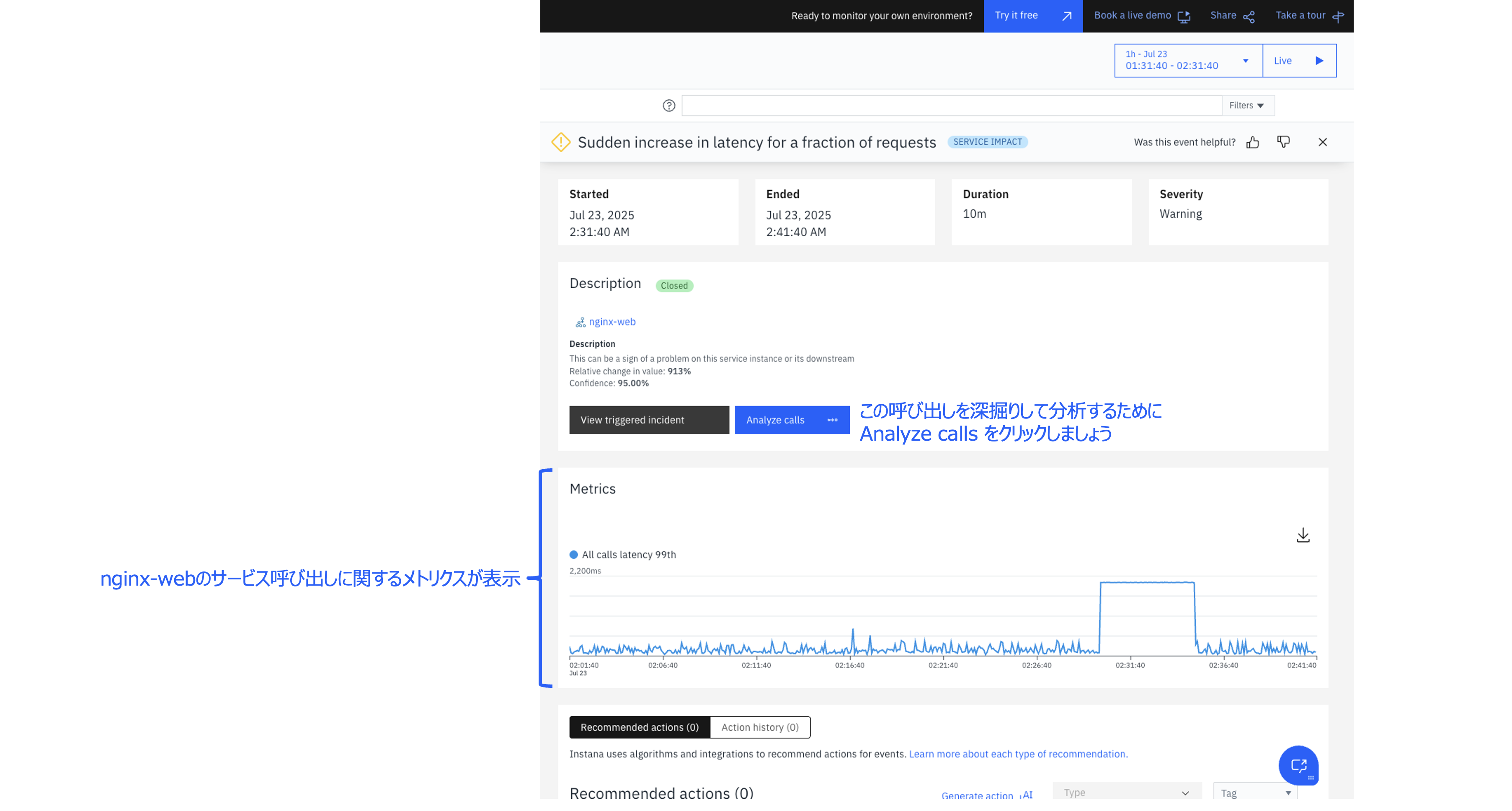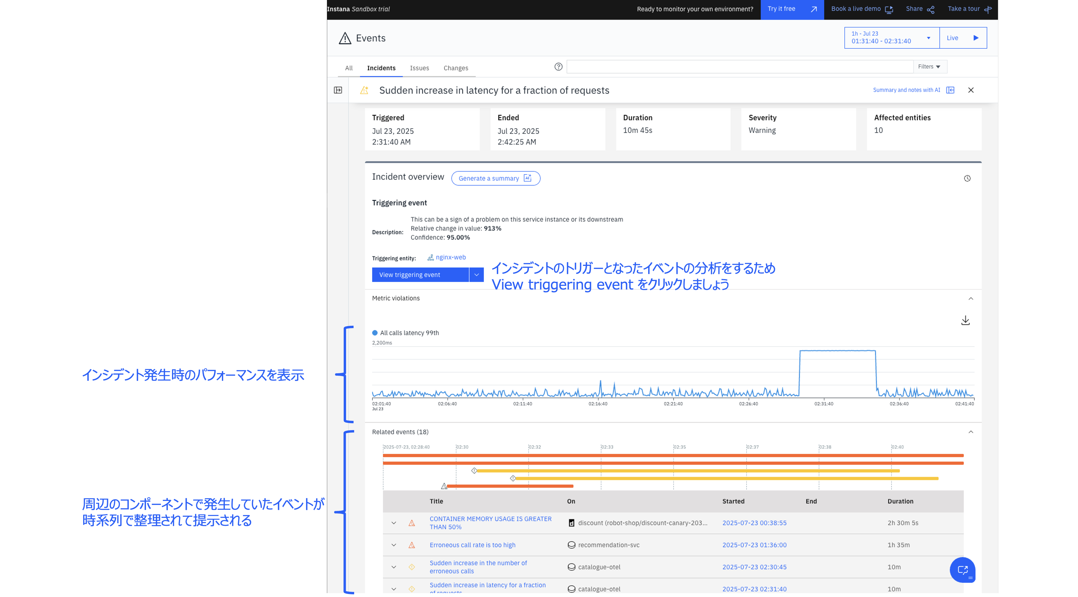 アラート(インシデント)が発生すると、左パネルのイベントのアイコンに数字が表示されます。 イベントのページでは、インシデントの一覧と各インシデントの発生場所や時間などが表示されます。 ゴールデン・シグナルに対する機械学習により、トリガーとなったインシデントが表示されます。