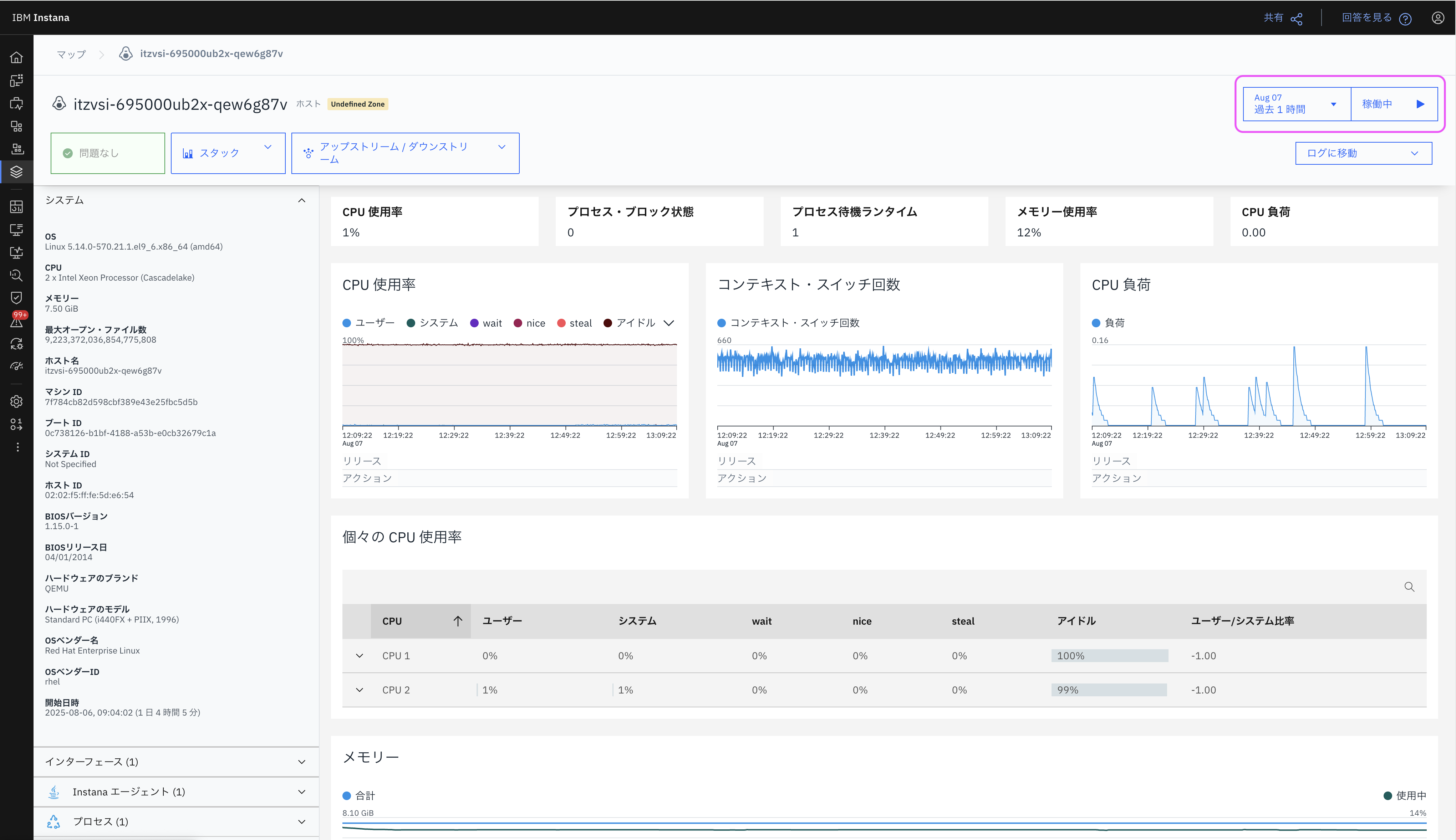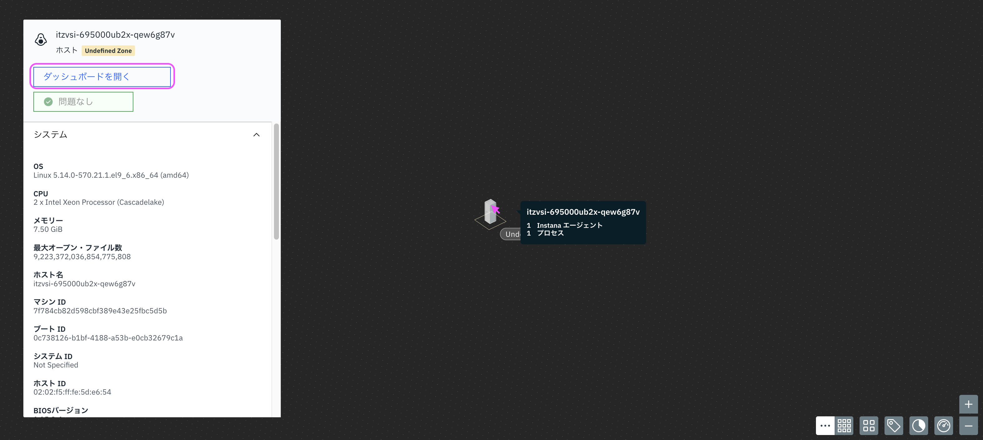 柱をクリックすると、システム、インターフェース、InstanaAgent、プロセスの情報を見ることができます。