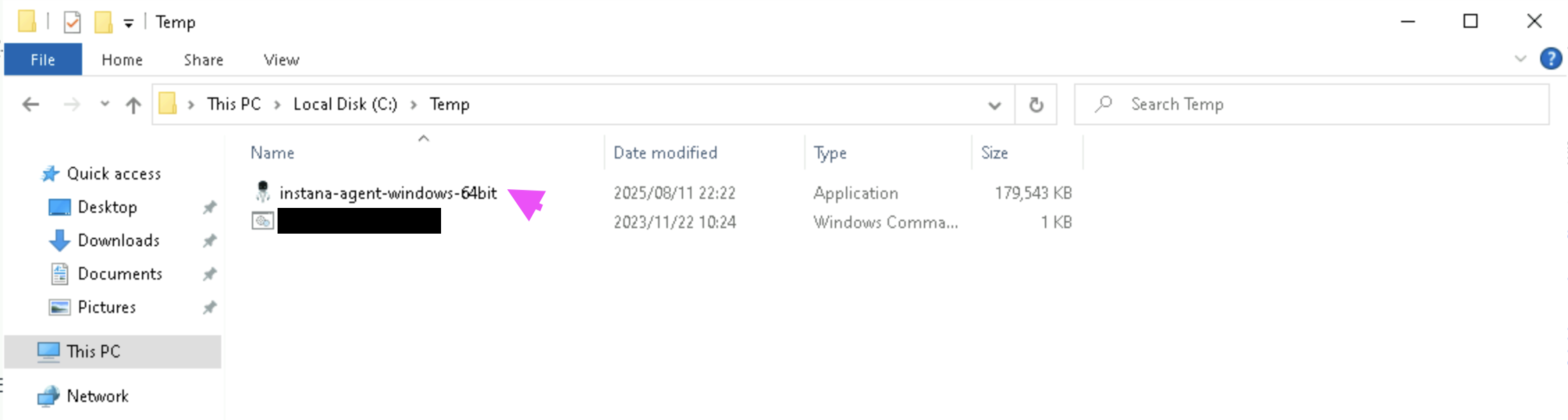 対象となるWindowsにログインし、ダウンロードしたインストーラーを任意のディレクトリ(例:C:\temp)に配置し、実行します。