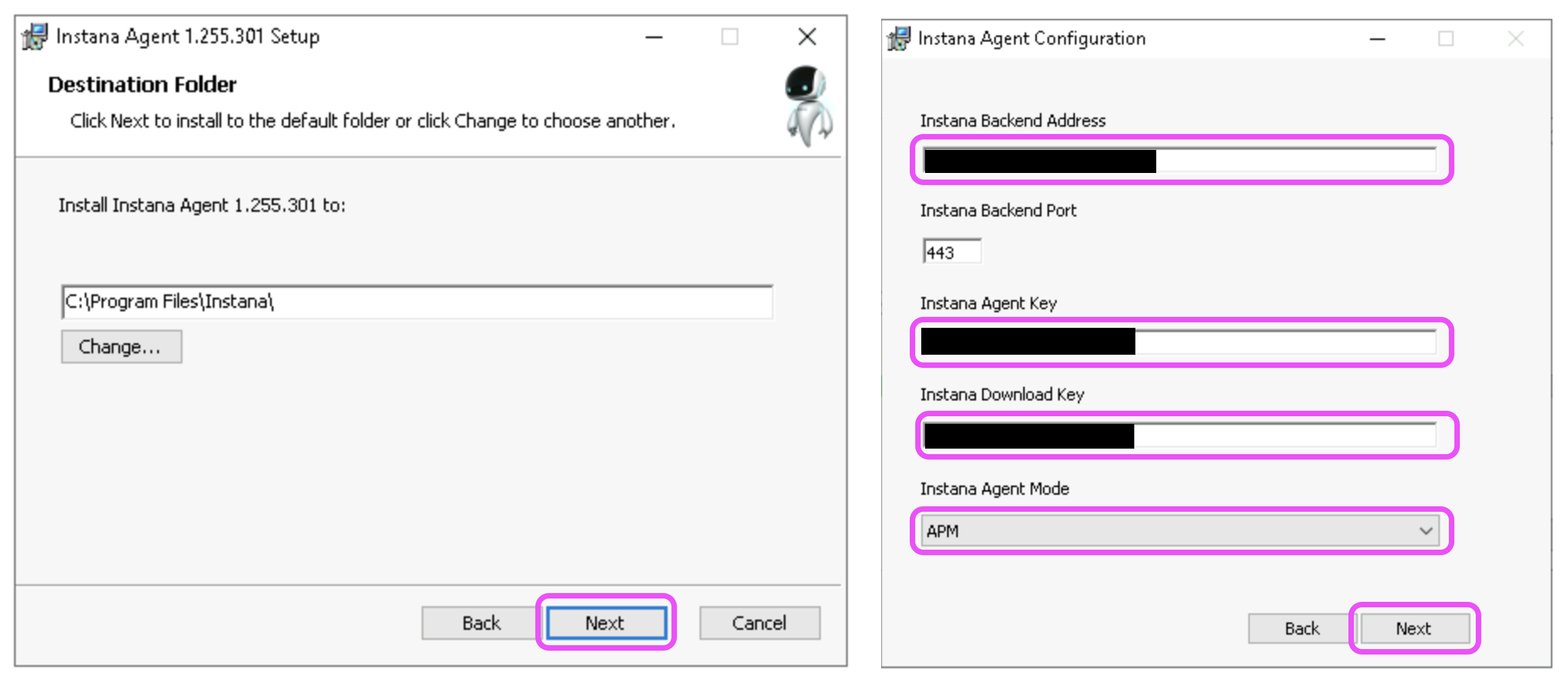 次に、Installerダウンロード時に、Instana Backend画面上に表示されていた値を入力します。