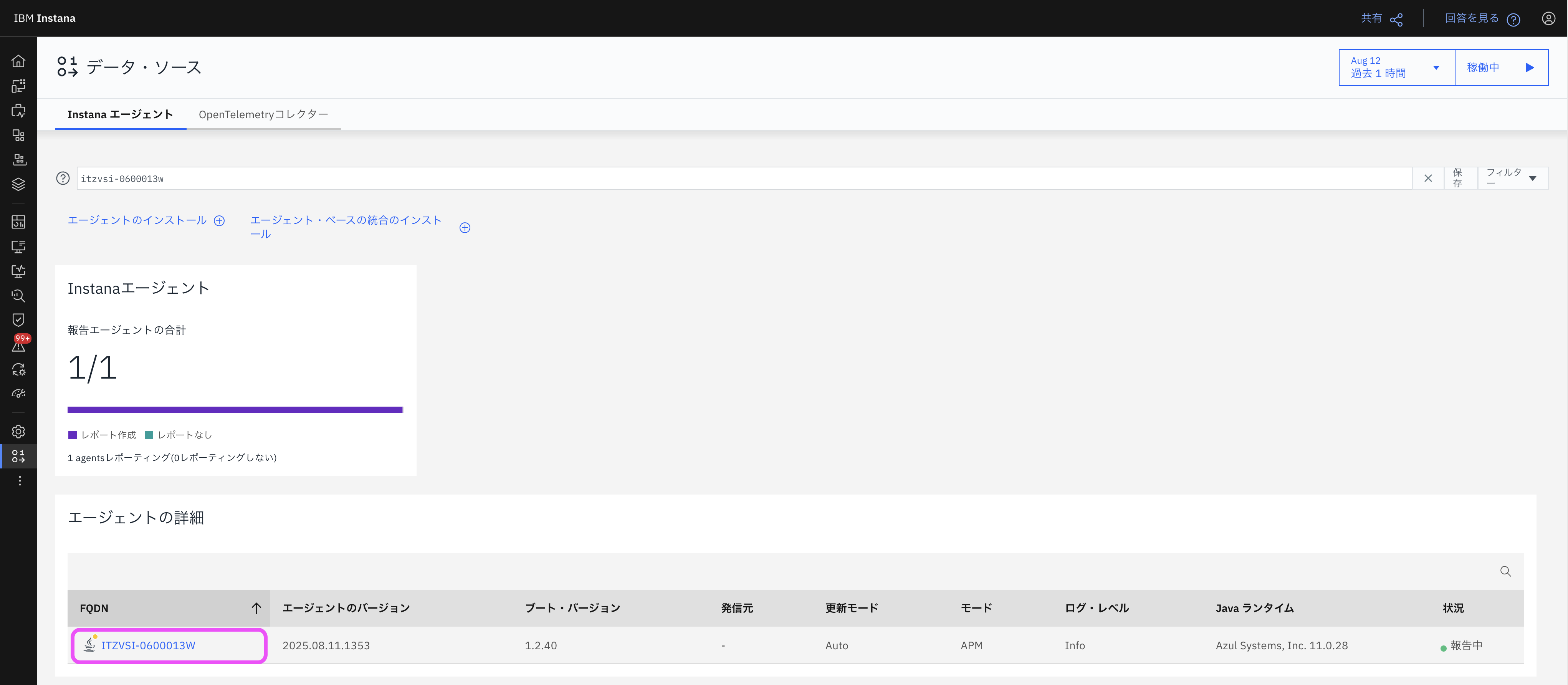 データ・ソースで、InstanaAgentのページからインストールしたAgentを確認することができます。