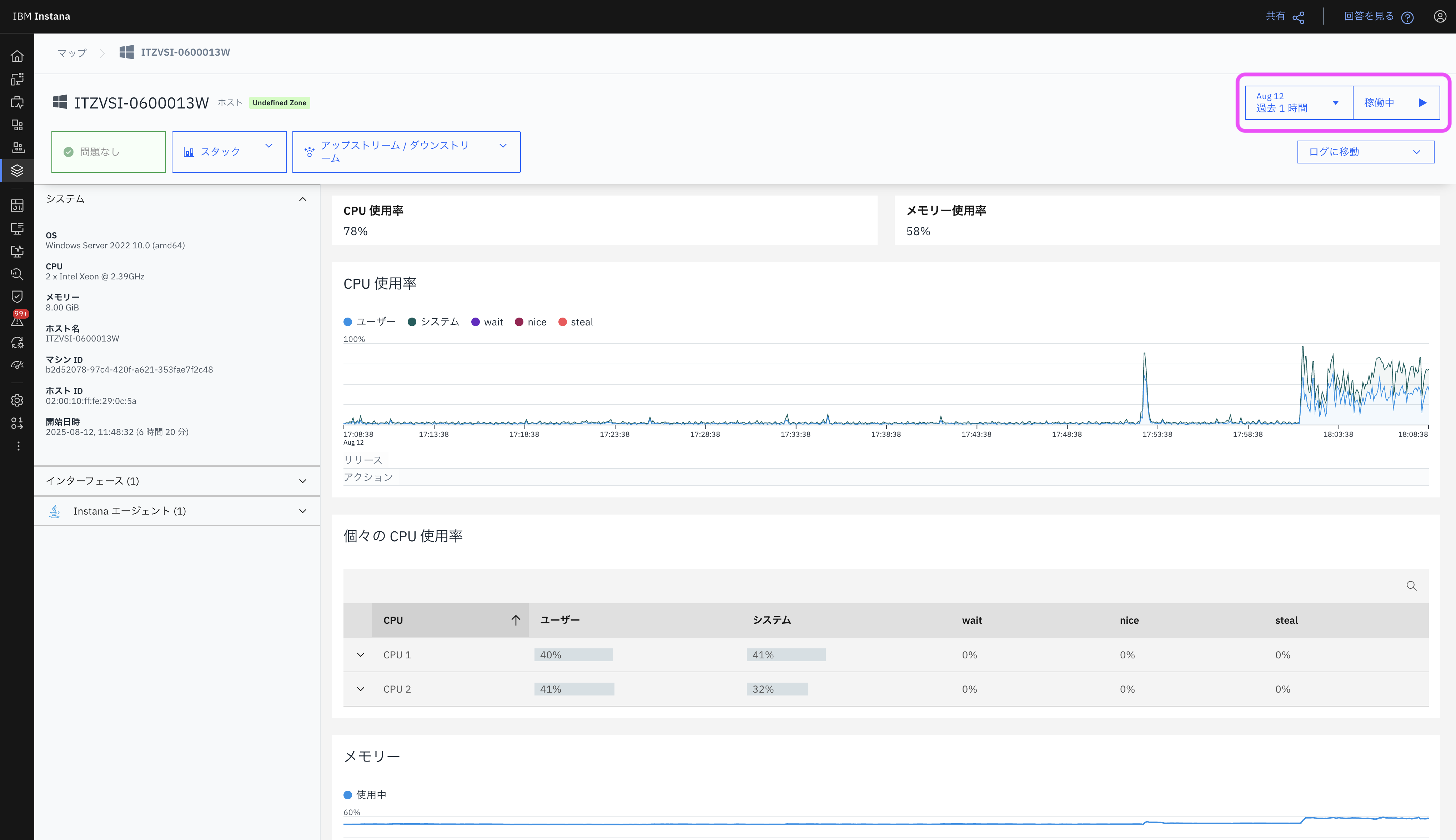 また、柱をクリックすると、システム、インターフェース、InstanaAgent、プロセスの情報を見ることができます。