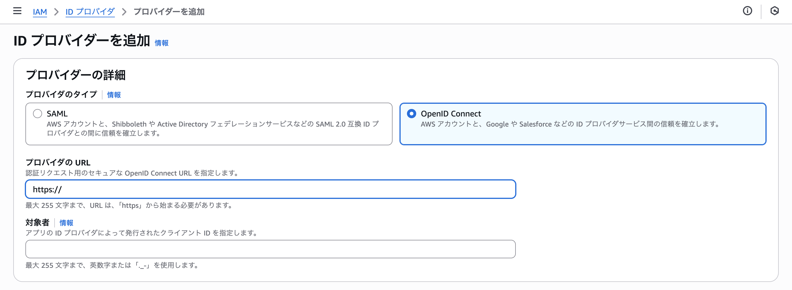 2025年11月17日 現在 AWS アジア太平洋(東京)の場合は、どちらかのOIDCプロバイダー URLの指定が必要となります。 URLが間違っている場合は、接続が失敗する可能性のひとつとなるためご注意ください。