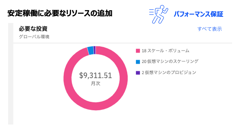 下の円グラフではリソース追加時に、必要となる投資の額が表示されています。Turbonomicによって提案されたアクションを実行すると、全体でこれだけの投資が必要になることが、ひと目でわかるようになっています。