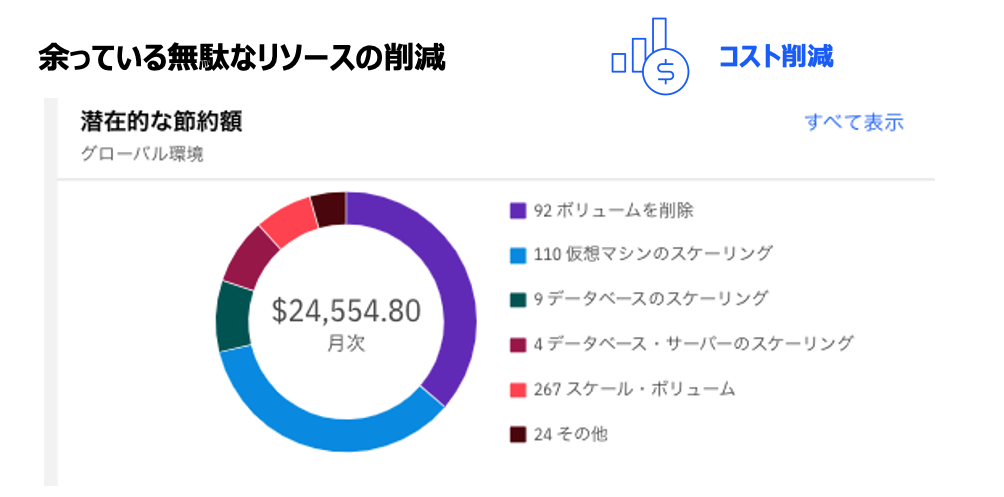 コストと先述のFinOpsは切り離すことができません。Turbonomicでは、余剰や無駄なリソースを削減することによって、コストを削減することが可能です。