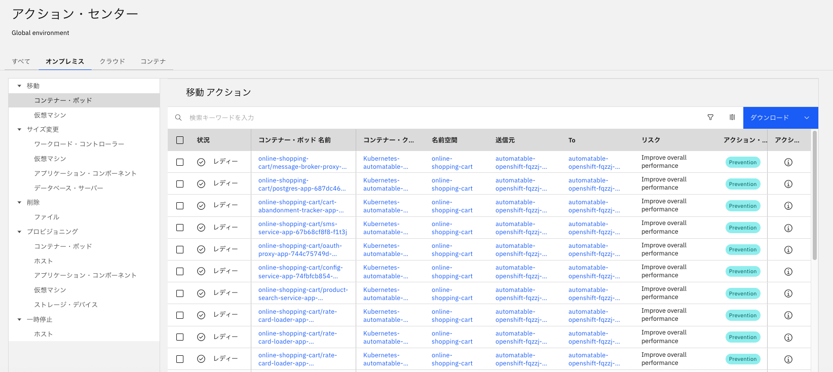 アクション・センターでは、すべてのアクションが見れるほか、オンプレミス、クラウド、コンテナといった個別のプラットフォームのアクションを確認することも可能です。