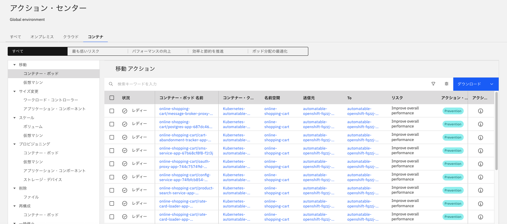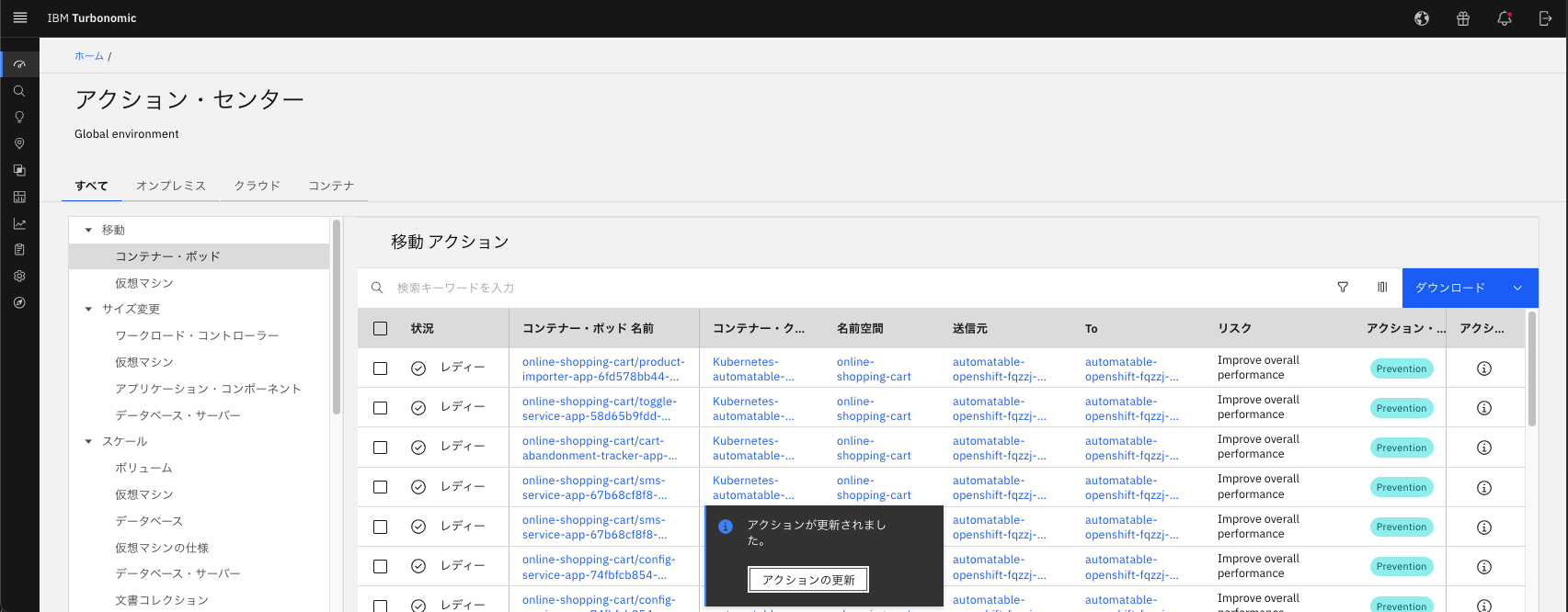 このタブによって、さらにアクションの優先度を変化させ、最も低いリスクのアクションだけを表示させることやパフォーマンスに割り振られるアクションを表示させることも可能です。コンテナタブはTurbonomic8.16.xxのバージョンではサプライチェーンからしかアクセスできませんでしたが、このようにアクションにも表示されるようになり、コンテナの最適化も進んでいることが伺えます。