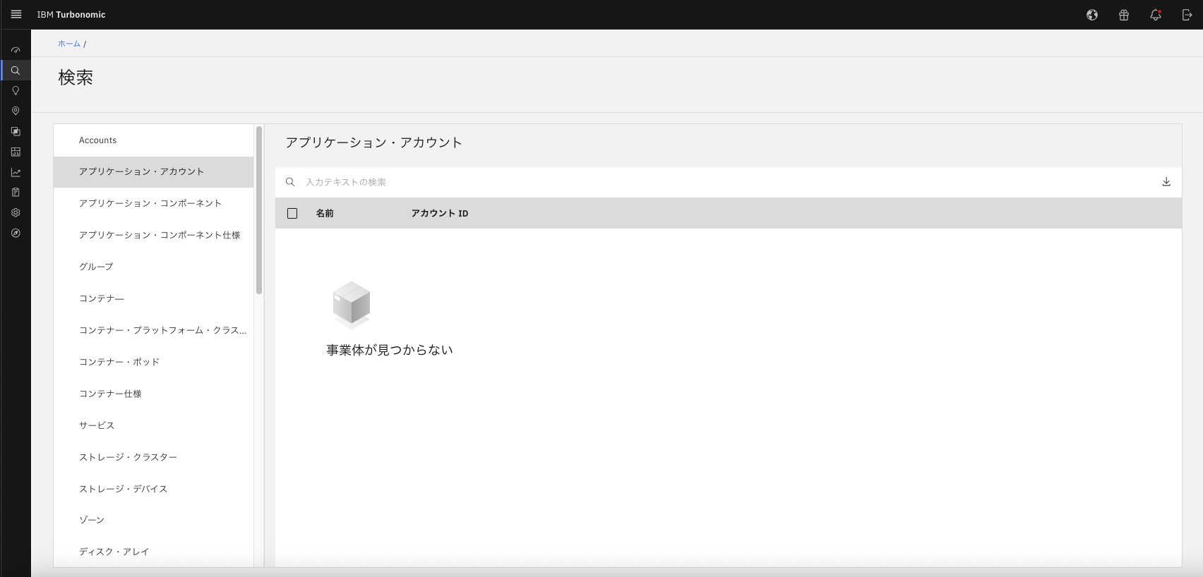検索画面に遷移すると下記の画像のように表示されます。今回はアプリケーション・アカウントが選択された状態のスクリーンショットとなっていますが、通常は検索の種類一覧の上にある、Accountsが選択されています。