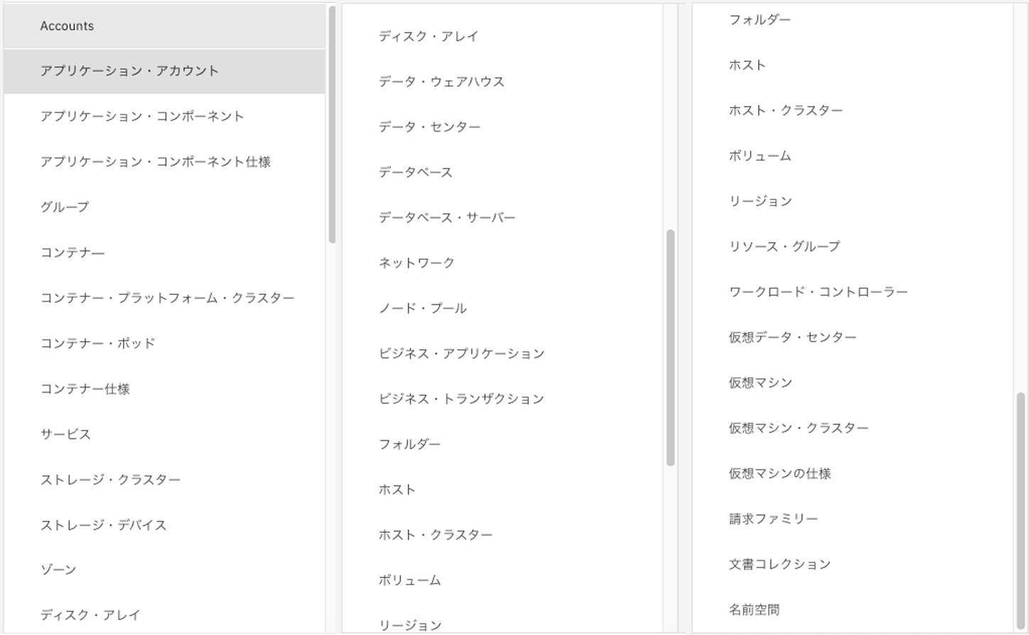 次の画像では、先ほど検索対象の種類一覧を出しています。Accountsから名前空間までの一覧をまとめました。検索条件として、クラウドのターゲットを検索したい場合はゾーンや仮想マシンなどを利用して、一覧から絞り込みをかけていくことが可能です。