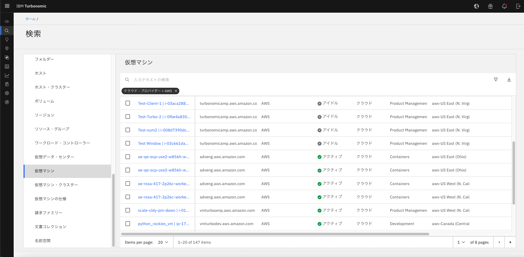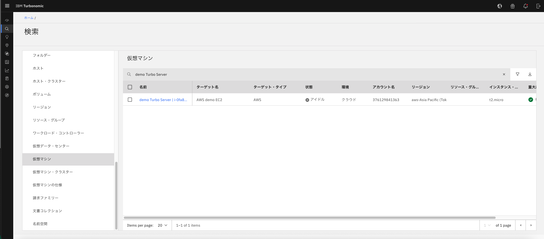 対象の条件で調べると仮想マシンの中のdemo Turbo Serverという名の、AWSの仮想マシンが検索結果に出てきました。このように、対象が仮想マシンで、名前がわかっていれば検索の絞り込みをかけることが可能です。