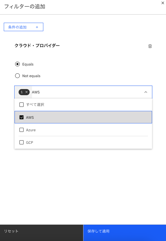 さらに高度な検索を行いたい場合を考えましょう。例えば「AWS環境だけを絞りたい」という場合にも検索機能を活用することができます。検索バーの右側のろうとのアイコンをクリックすると「フィルターの追加」という画面が右からスライドインしていきます。このフィルターを設定してみましょう。