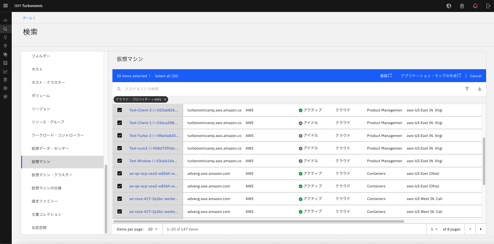 先ほどの画像で表示されていたAWSの環境について、表示された件数のうち、20件をチェックしてみましょう。すると、検索バーの上部に、青いバーが表示され「20 items selected」と表示されているのがわかります。その状態で、「範囲」を押下してみましょう。