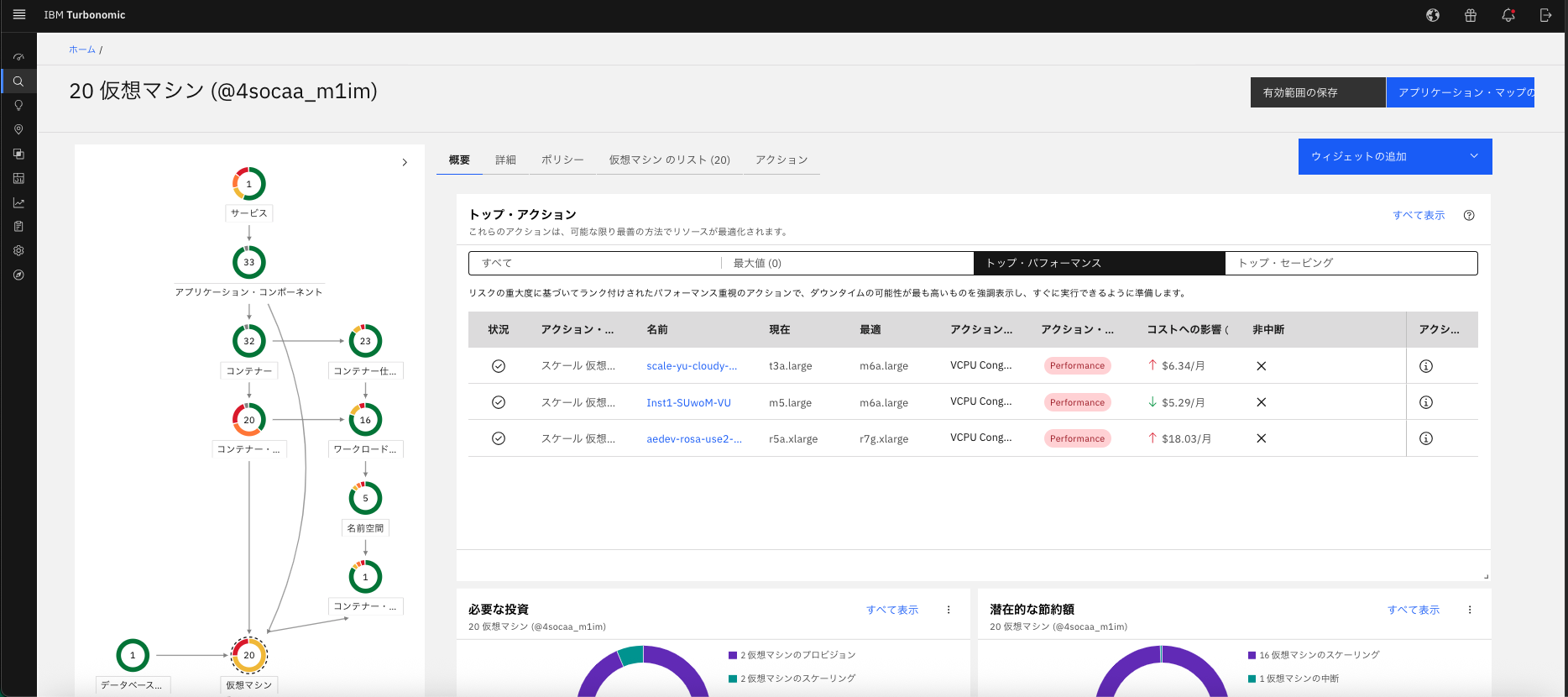 すると左上に20仮想マシンと表示されている画面に遷移します。これは、絞り込みをした後に選択した20件をまとめてダッシュボードに表示しています。この画面では、左側に各アプリケーションやサービス、データベースの関連を表したサプライチェーンの表示はもちろんのこと、アクションについても表示されます。