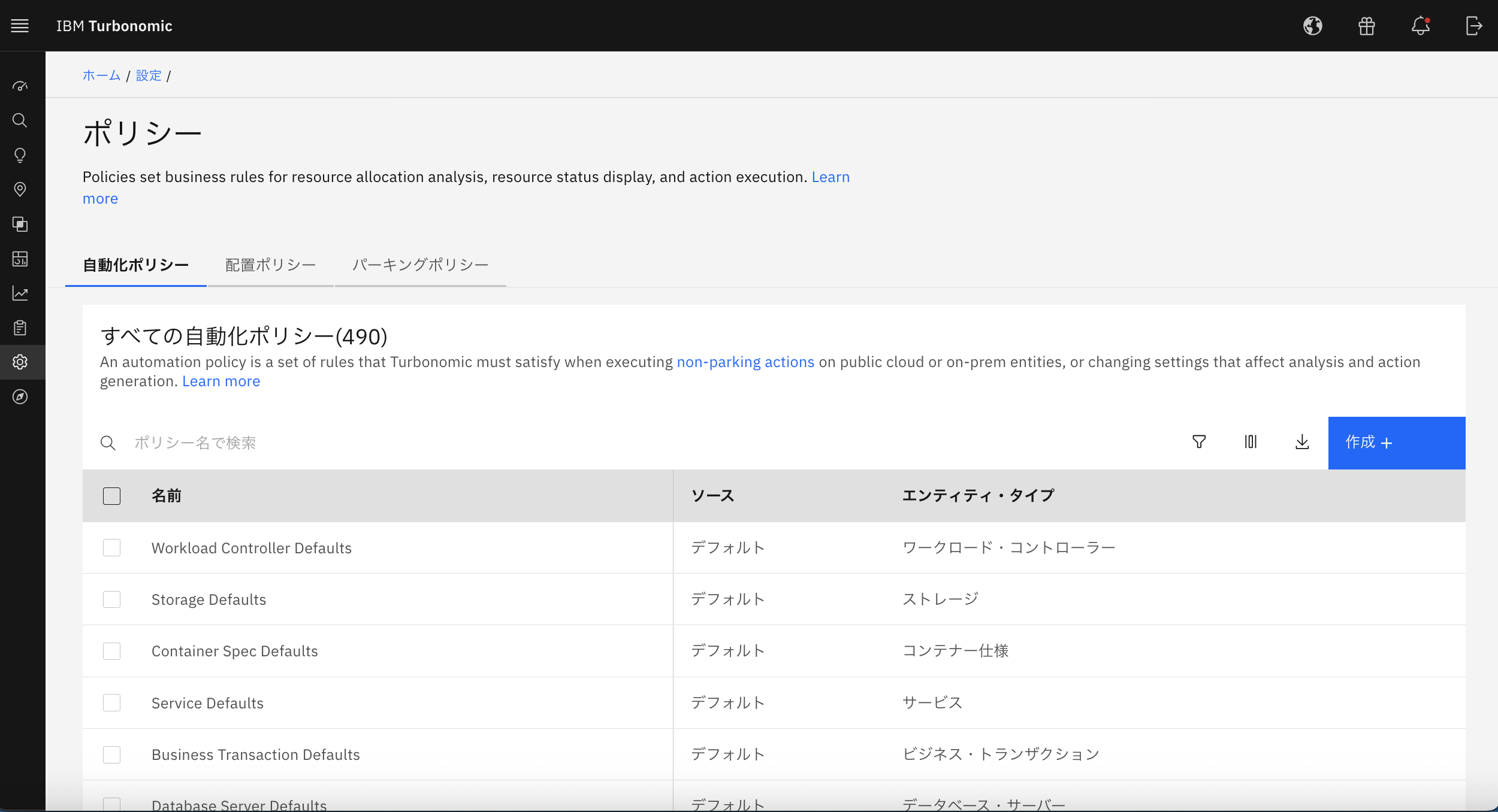 ポリシーに遷移すると、まず目に入ってくるのが自動化ポリシーです。タブが他にも存在しており、配置ポリシー、パーキングポリシーと、各ポリシーが存在しています。