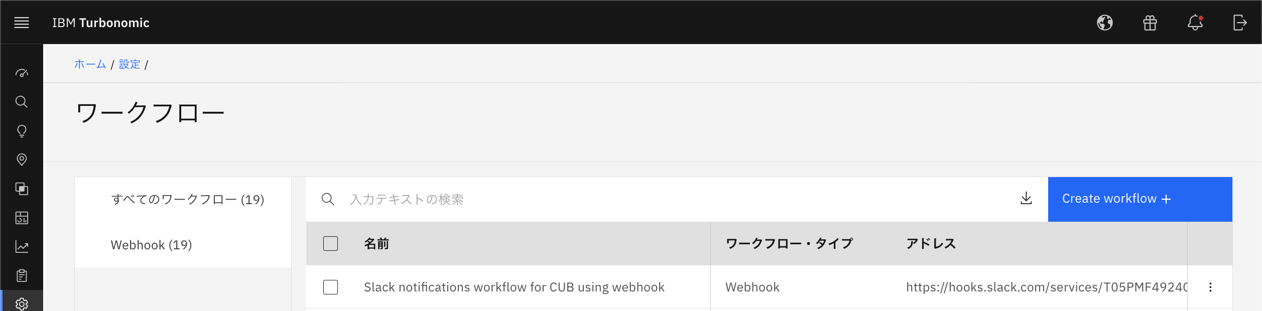 外部アプリケーションとの連携の管理、ワークフローを管理する項目です。新規ワークフローを作成すると、Webhookの項目が表示されます。