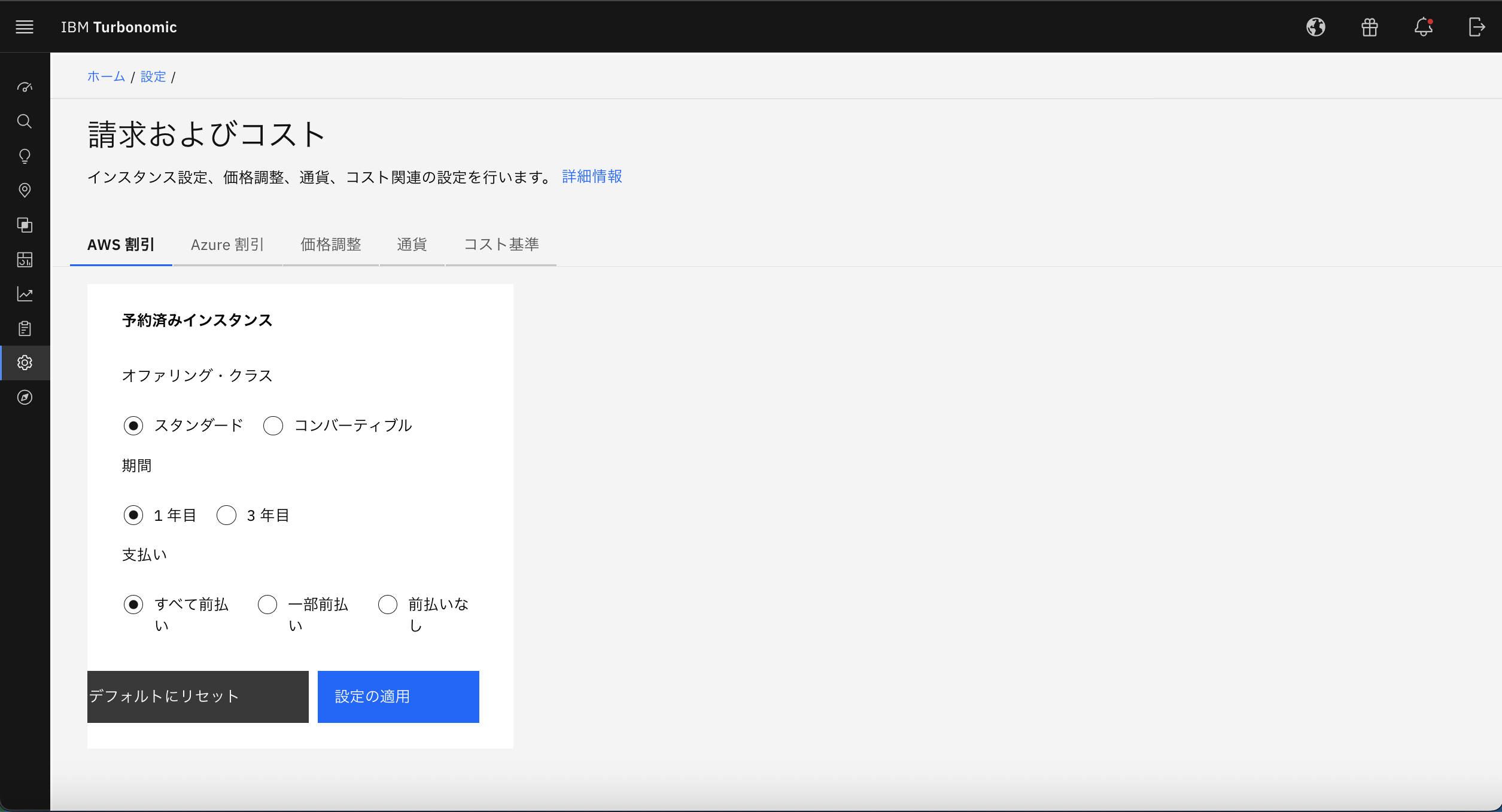クラウドについて、計画機能で試算を行う際に、利用する設定を決めることができます。規定の条件にしておくことで、常にその条件を利用することが可能です。