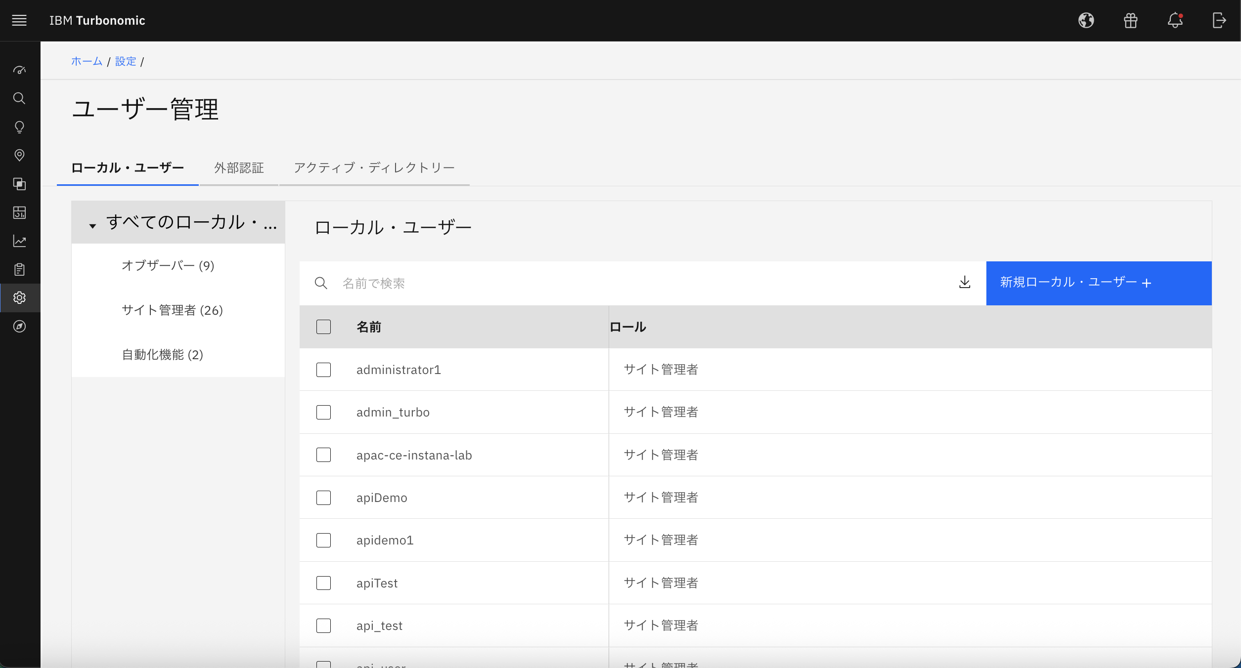 ユーザー管理のページを見るとローカル・ユーザーや外部認証、アクティブ・ディレクトリーなどの項目があります。ユーザーIDとパスワードで管理するローカル、外部の認証を用いてセキュリティを強化する外部認証などの設定が可能です。