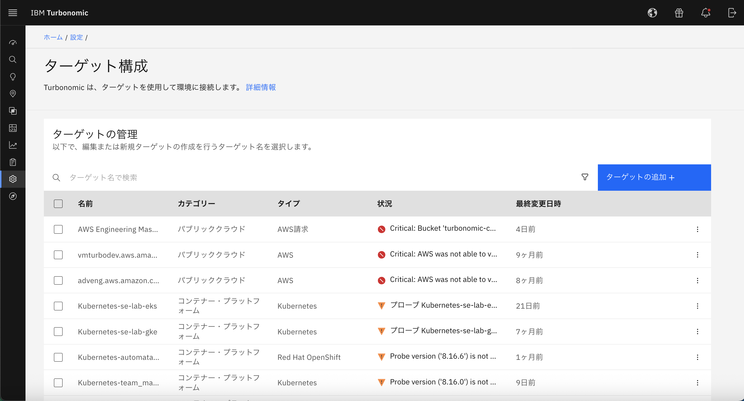 どのようなターゲットが設定できるのかは「ターゲットの追加」を押すとすぐに一覧で確認することができます。非常に重要な機能であり、ターゲットの設定が行われることで、Turbonomicによる管理が始まります。