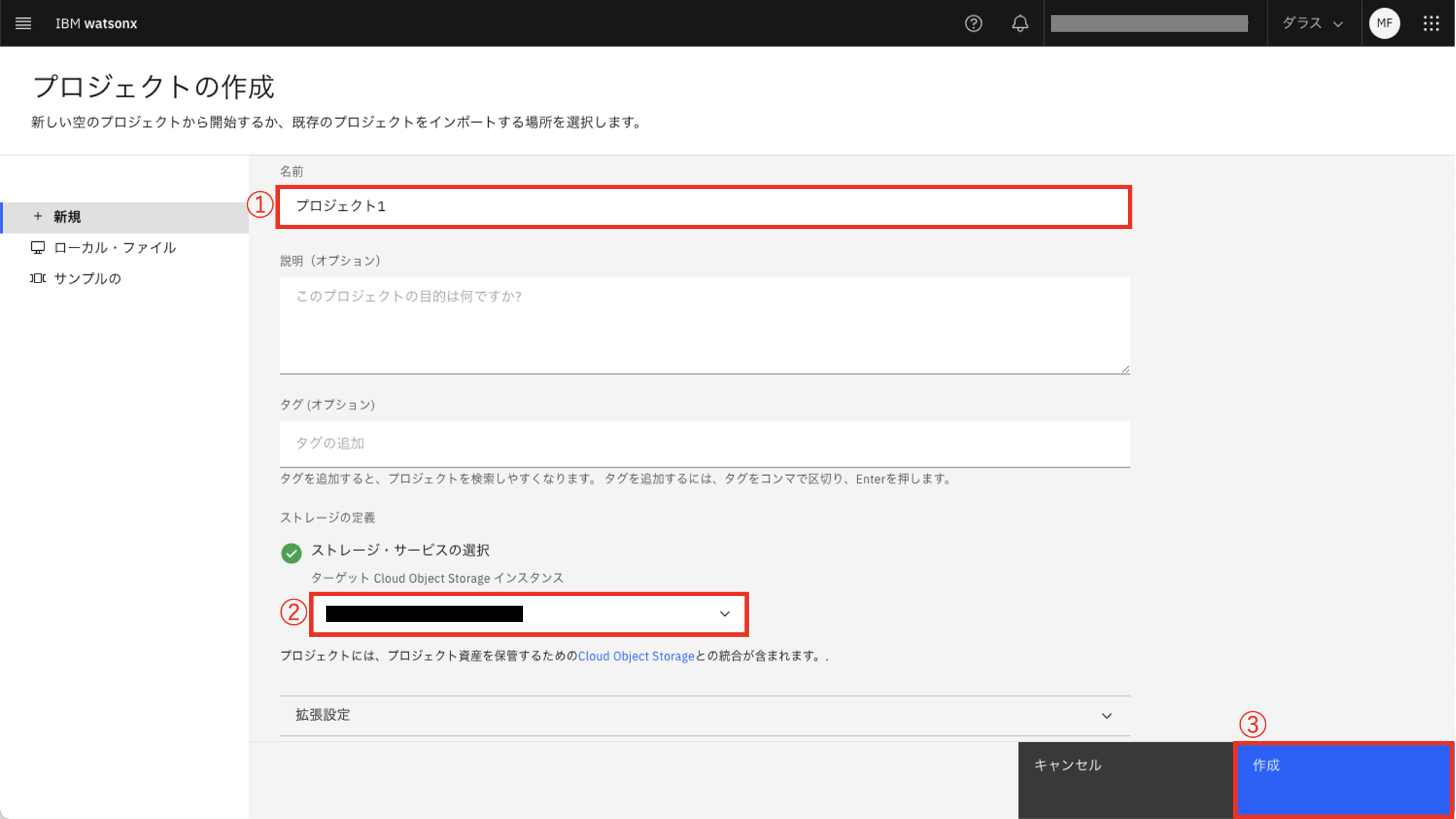 - ①名前に任意の名前を入力し、②ストレージ・サービスの選択 でサービスを選択、③作成 をクリックしてプロジェクトの作成は完了