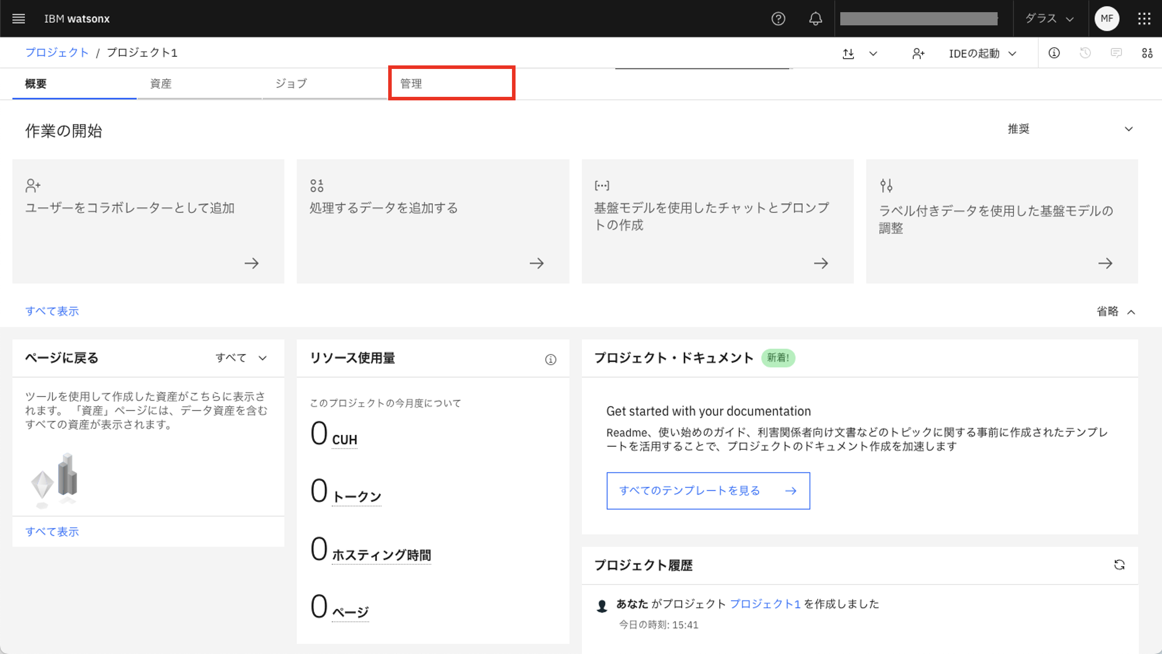 - プロジェクトの詳細ページに遷移するので、管理 タブをクリックする