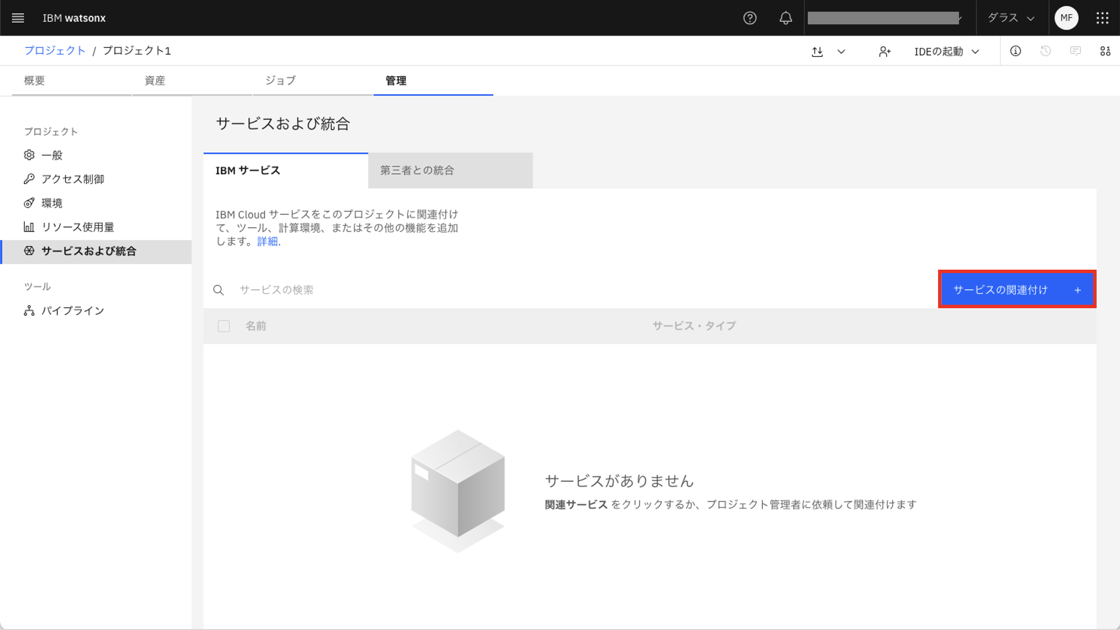 watsonx.ai のLLM を使うには、作成したプロジェクトにwatsonx.ai Runtime のサービスの関連付けをする必要があります。