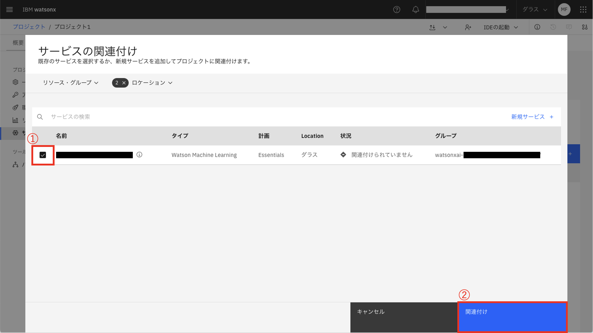 - ①watsonx.ai Runtime (Watson Machine Learning) にチェックを入れて、②関連付け をクリックする
