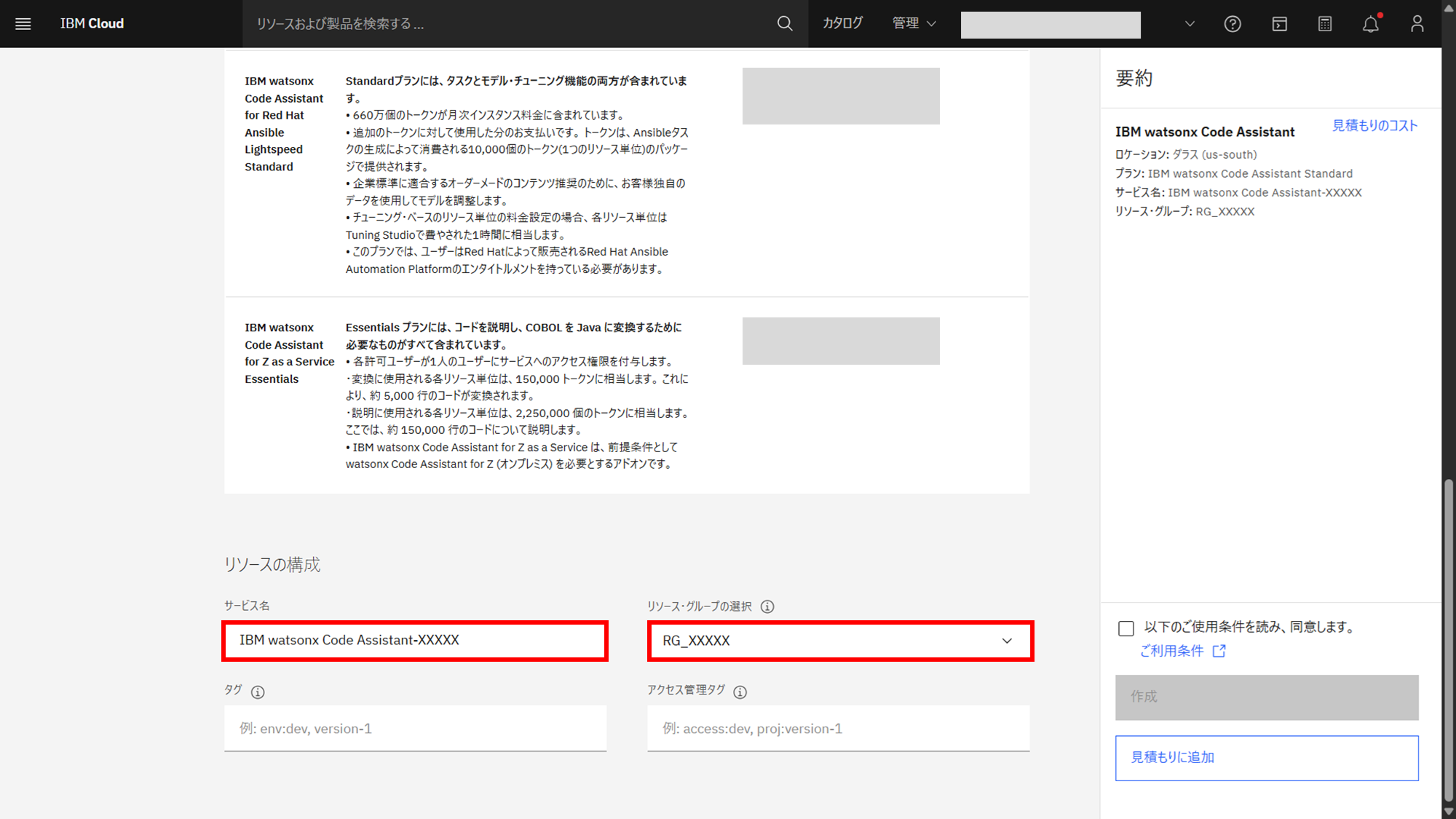 - リソースの構成 セクションで、サービス名に適切なサービス名を入力し、リソース・グループの選択で前工程で作成したリソース・グループを選択する。タグ/アクセス管理タグは空欄でOK