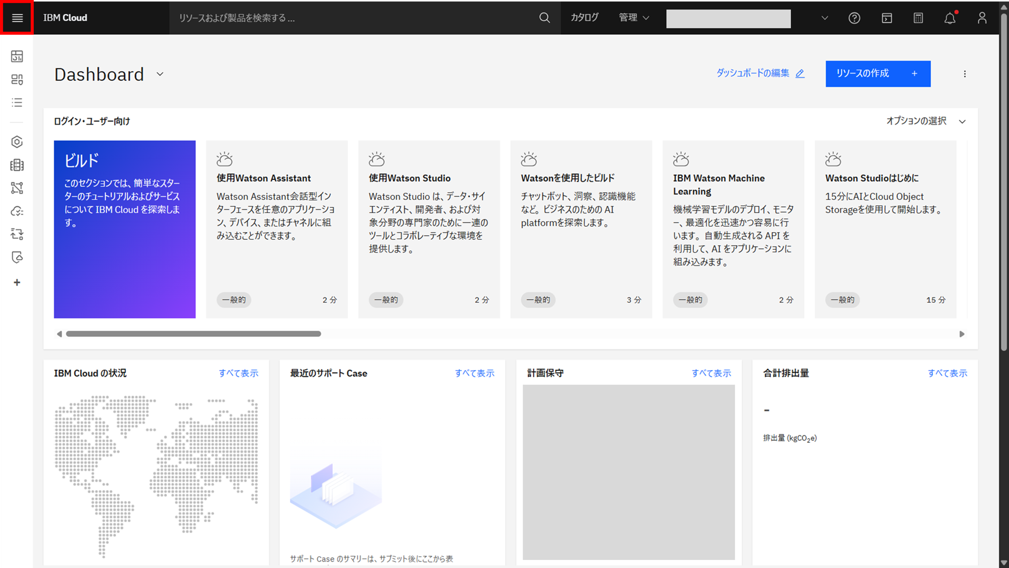 - IBM Cloud にアクセスし、左上のハンバーガーメニューを選択する
