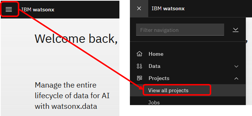 NotebookからMilvusに接続するPythonコードを作成するため、Projectを作成します。左上のナビゲーションメニュー(4本線)をクリックし、「Project」→「View all projects」を選択してください。