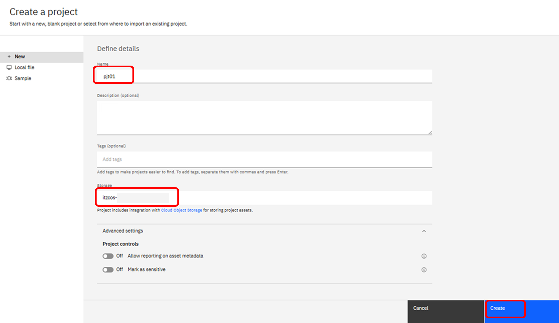 任意のプロジェクト名を入力し、このプロジェクトで使用するCOSバケットが選択されていることを確認したら、「Create」ボタンを押下し、プロジェクトを作成します。