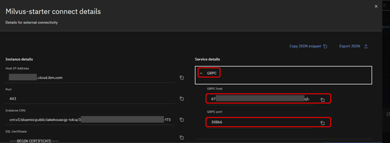 watsonx.dataで定義済のMilvusに接続するためには、下記の情報が必要です。
