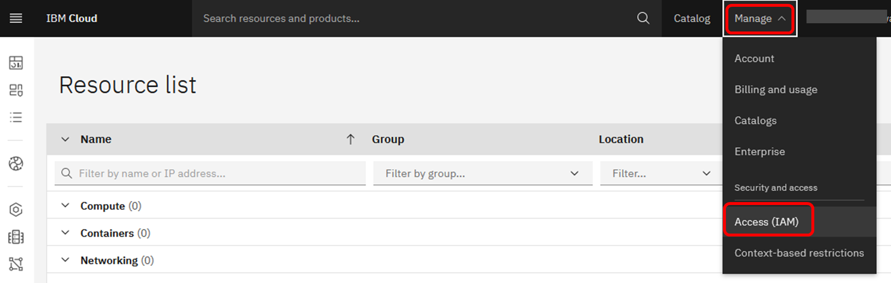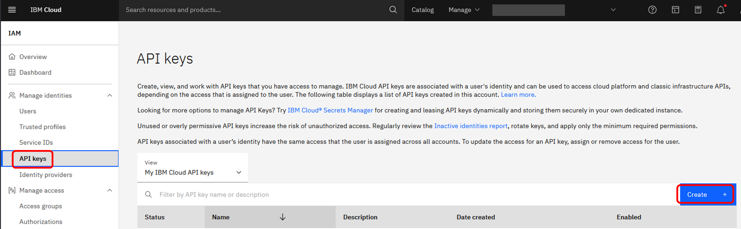 API Keyを作成するには、IBM CloudのManage → Access(IAM) から作成します。