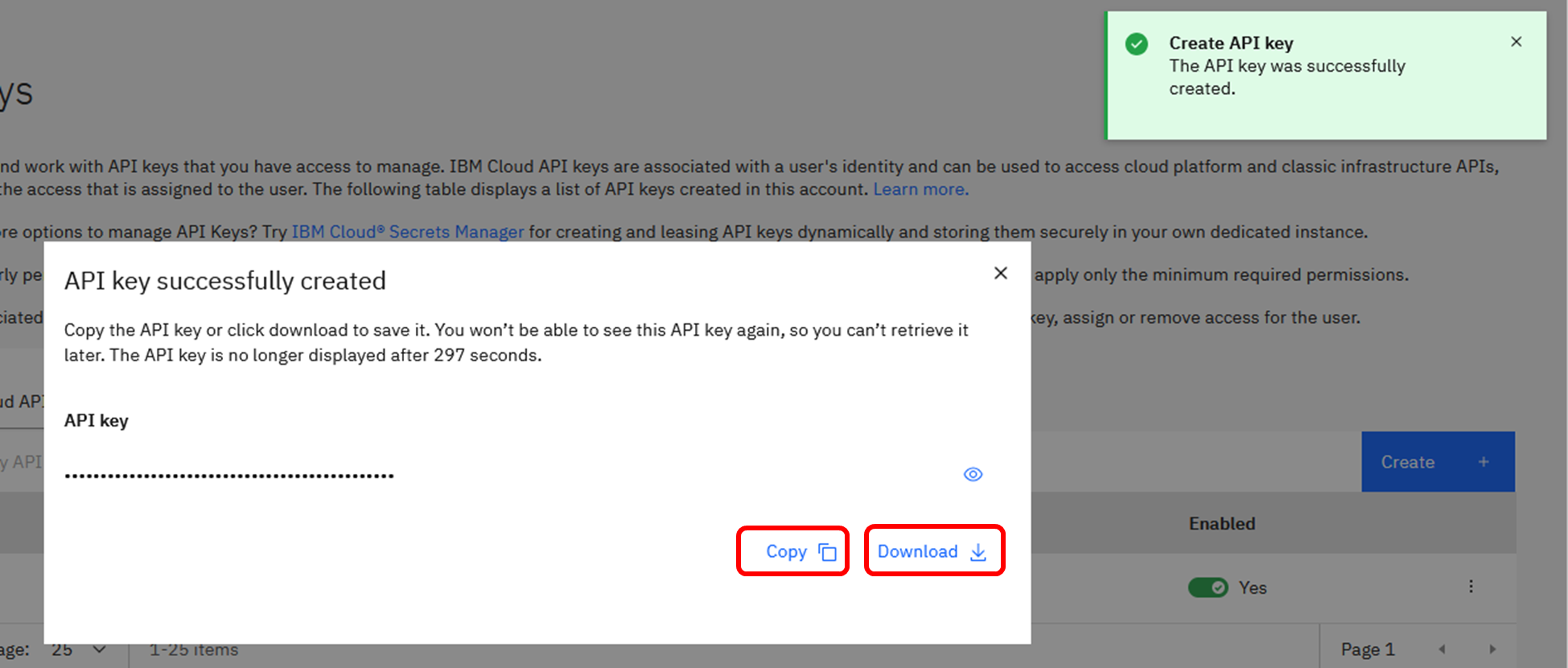 API Keyを「Copy」(クリップボードに文字列をコピー)、あるいは「Download」(JSON形式ファイルをローカルPCにダウンロード)のいずれかで保管します。