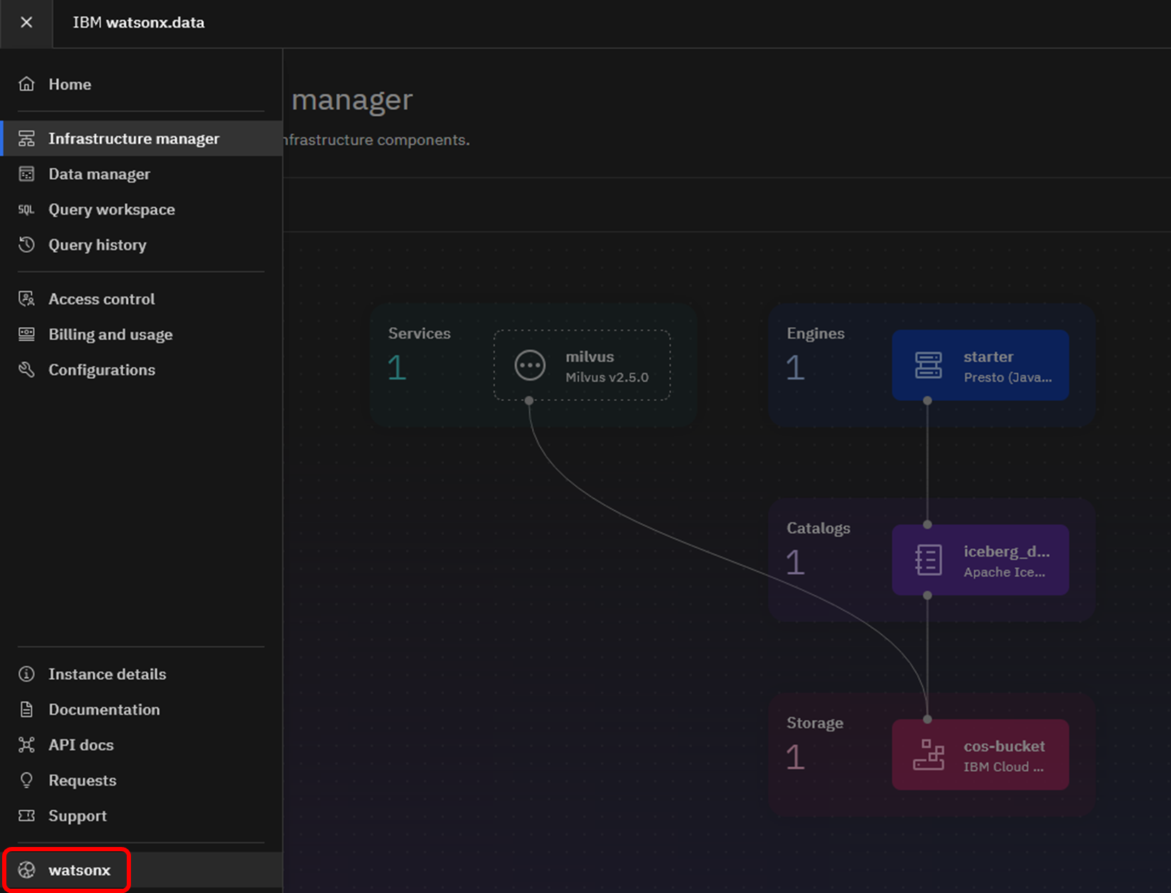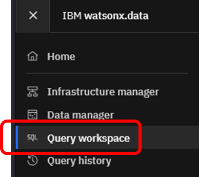 watsonx.data画面左上のナビゲーション・メニューから「Query Workspace」を選択します。