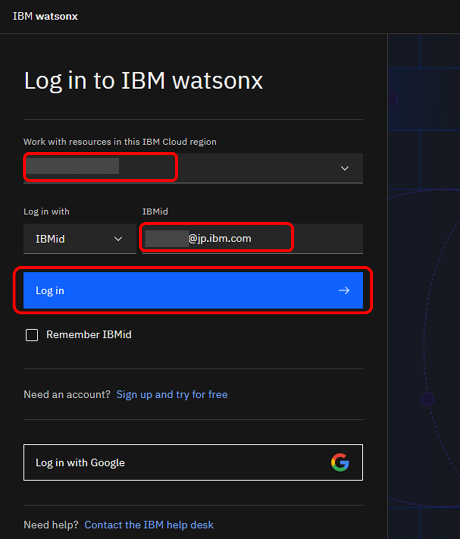 watsonxへのログイン画面が表示されたら、リージョンとIBMidを利用し、ログインを継続します。
