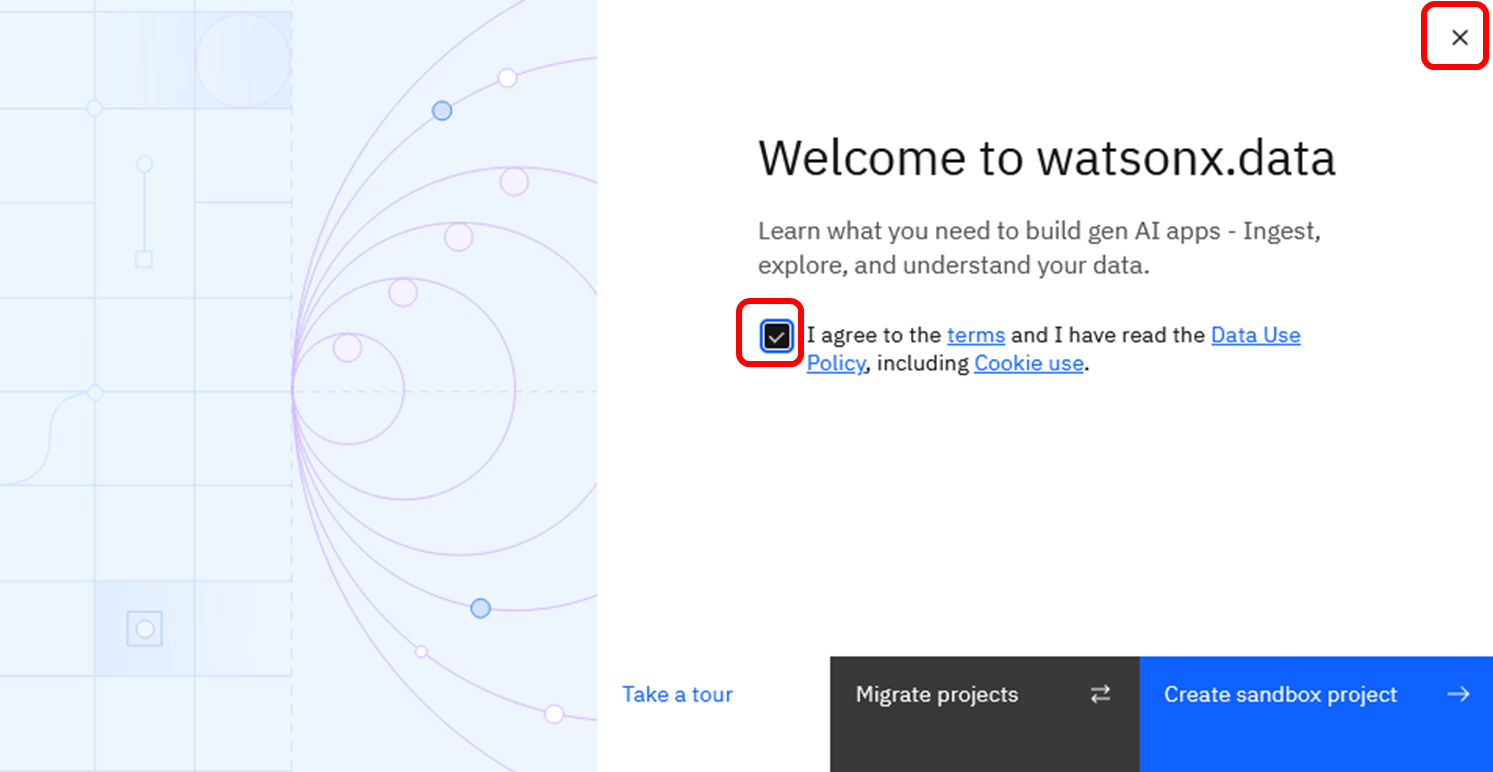 watsonx.dataのWelcome画面が表示されます。初回アクセス時は下記のようなメッセージが表示されます。Termsを確認後チェックボックスをクリックして下さい。簡単なUI紹介のツアーをスキップして良い場合は、右上のボタンからこのダイアログを閉じることができます。