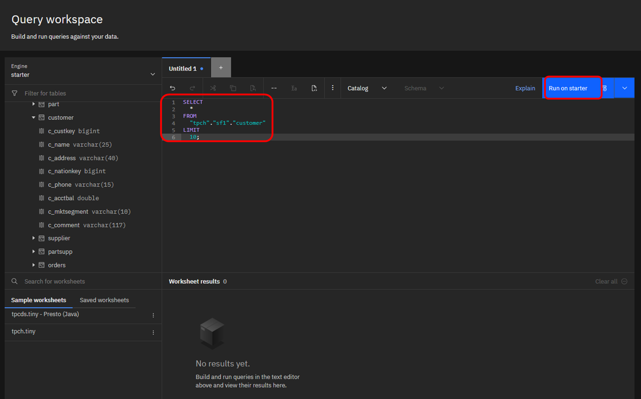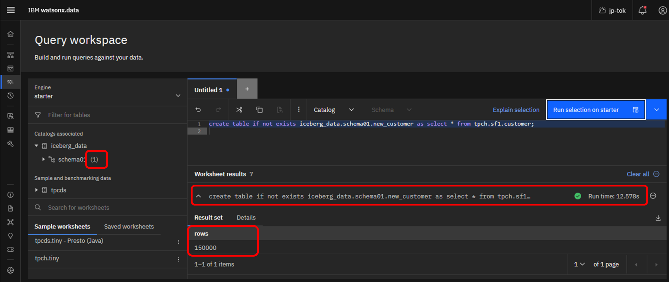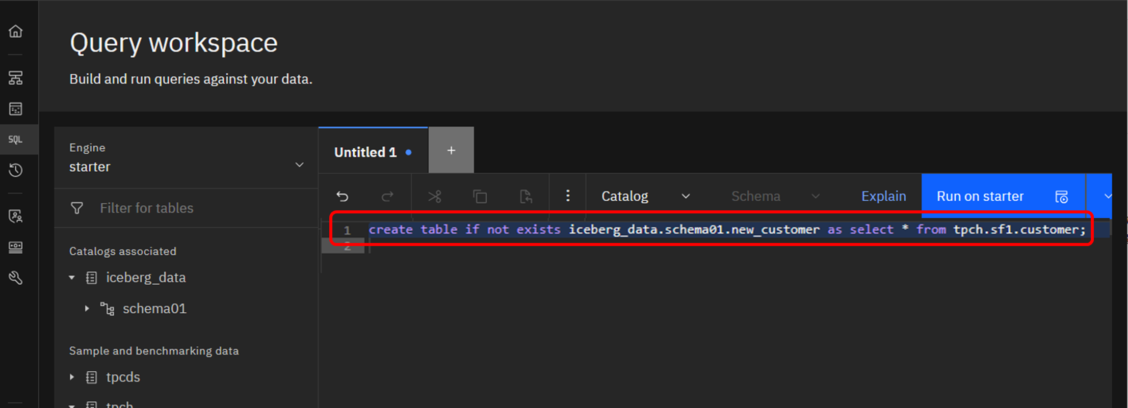 starterエンジンに紐づいているiceberg_catalogは、初期作成直後のため、まだデータが含まれていません。ここに、customer表からコピーした新しい表を作成します。