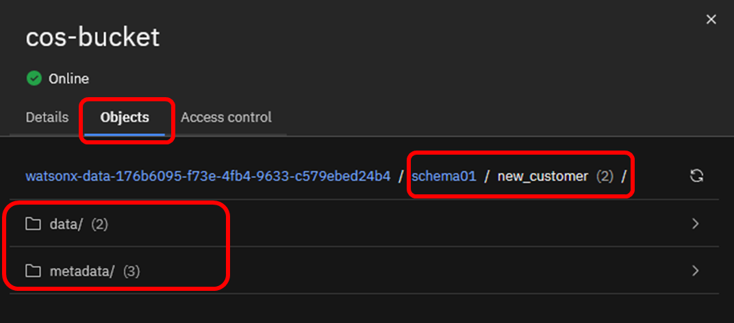 CREATE文から明らかなように、このスキーマに作成される表の実体は、該当カタログに紐づくCOS bucket の schema01/という仮想ディレクトリ配下に格納されることになります。