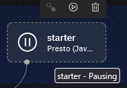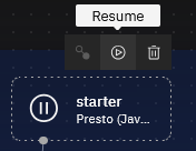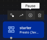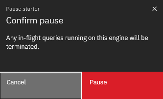 watsonx.dataのインフラストラクチャー・マネージャー画面で、エンジンやサービスのアイコンをマウスオーバーすると、「Pause」ボタンが表示されます。これをクリックすると、サービスを一時停止することができます。