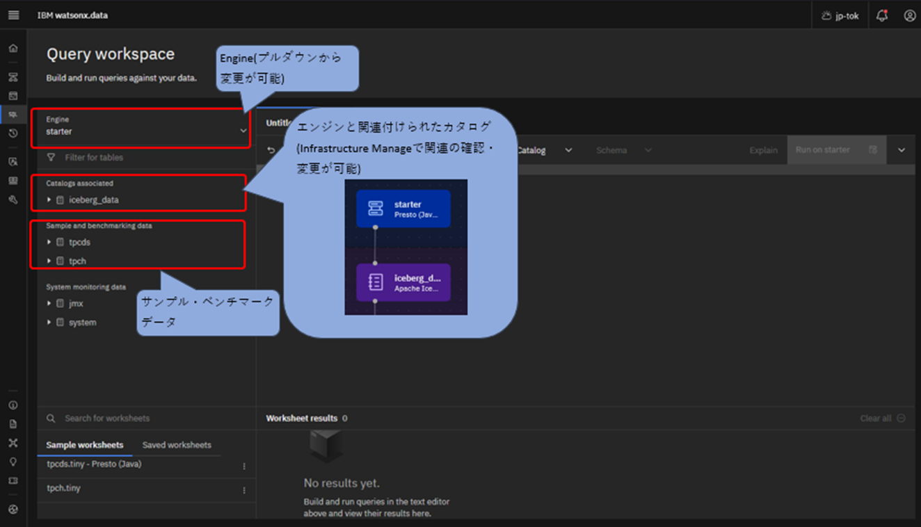 watsonx.dataのQuery Workspace(クエリー・ワークスペース)インターフェースを使用して、データをSQLで照会することができます。