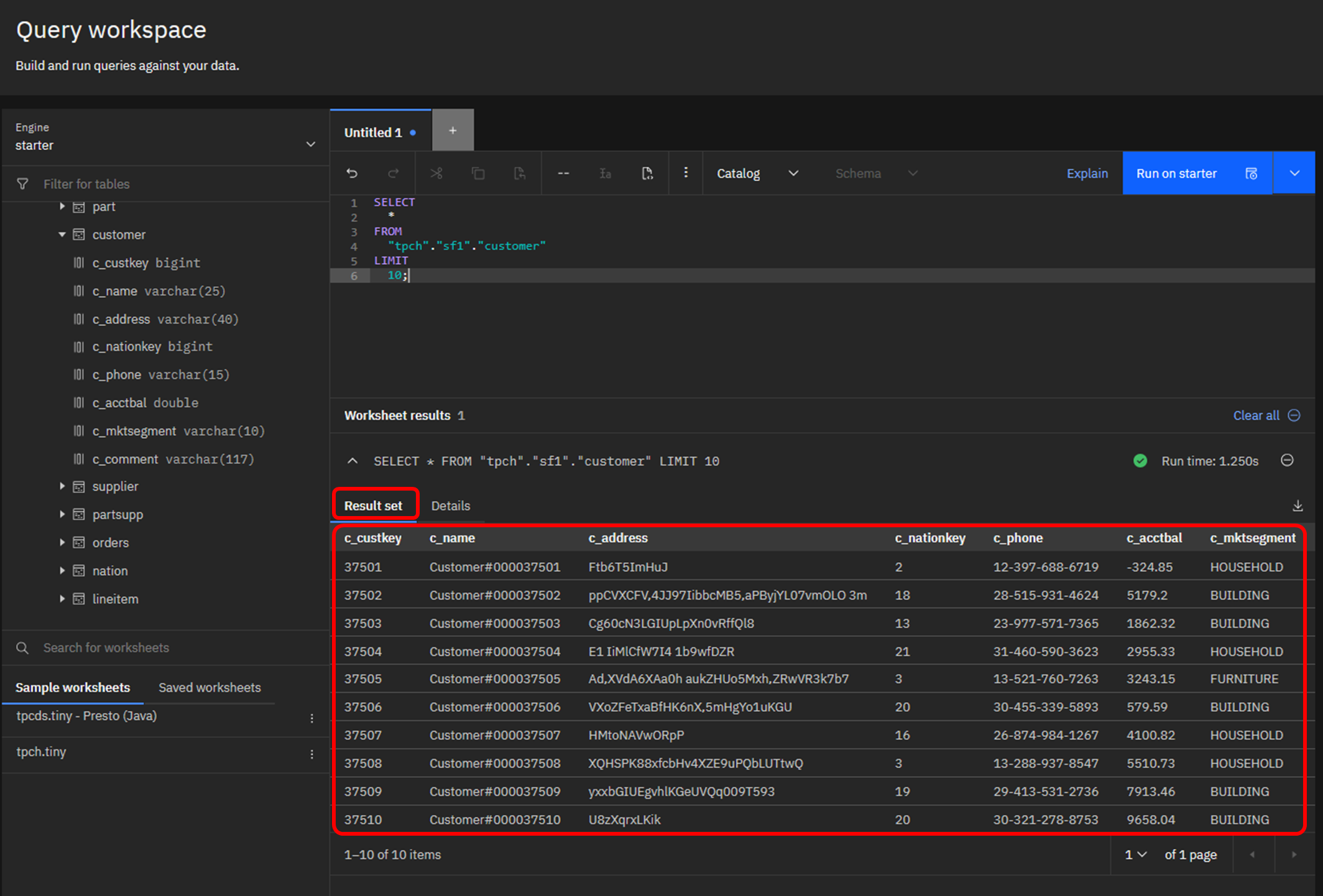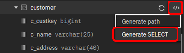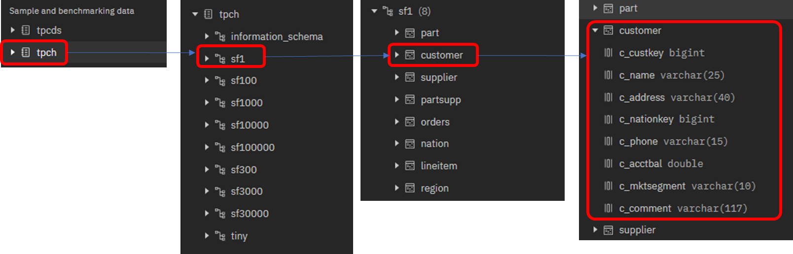 tpch -> sf1 -> customer と順にクリックし、データセットを展開します。