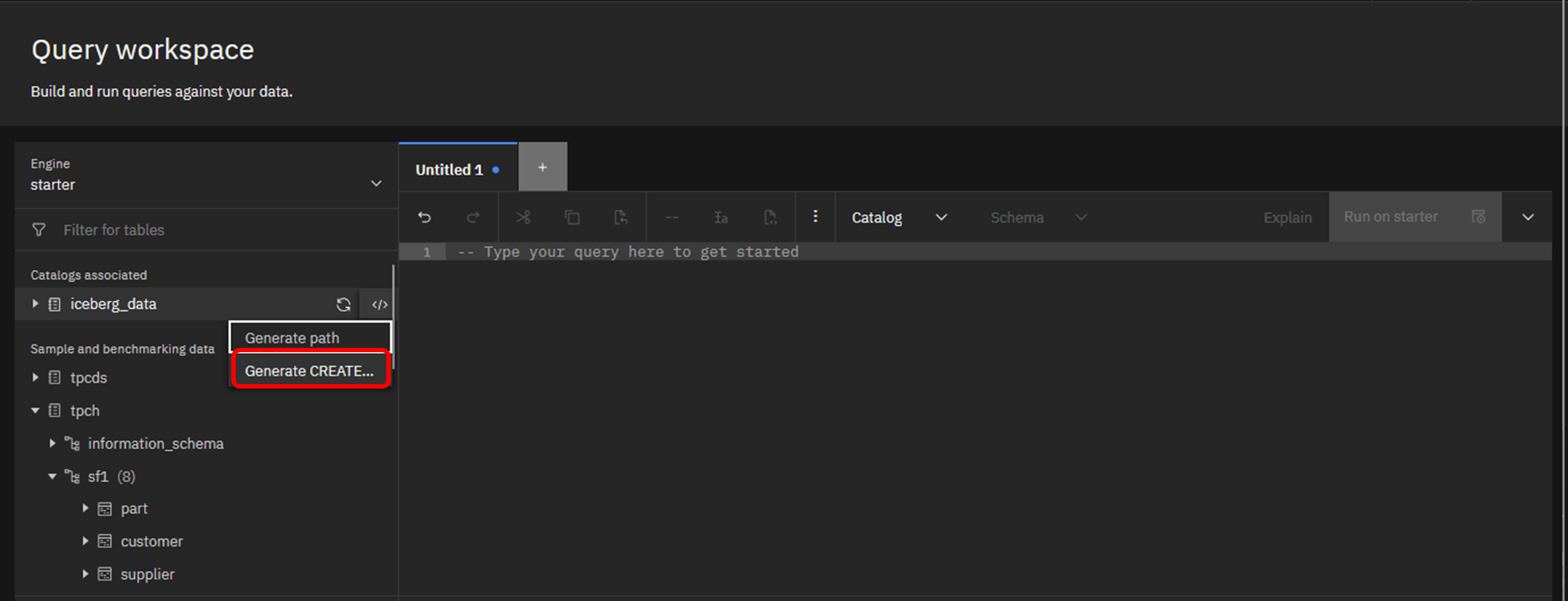 iceberg_catalogの右側メニューから、「Generate CREATE...」をクリックします。