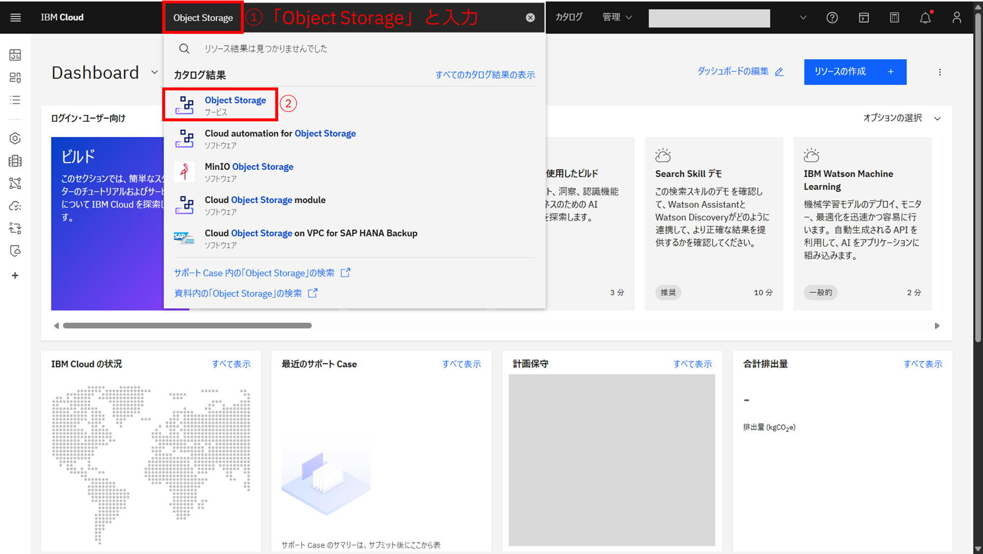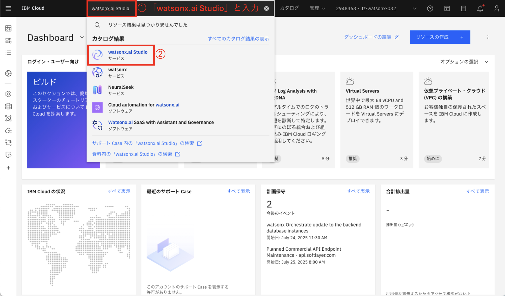 - 表示された入力欄に watsonx.ai Studio と入力し、数秒後に表示される カタログ結果 欄の watsonx.ai Studio をクリックする