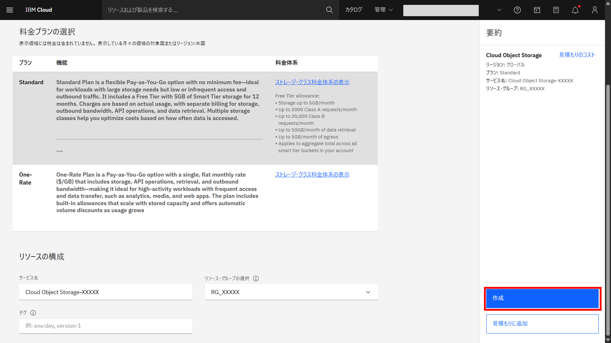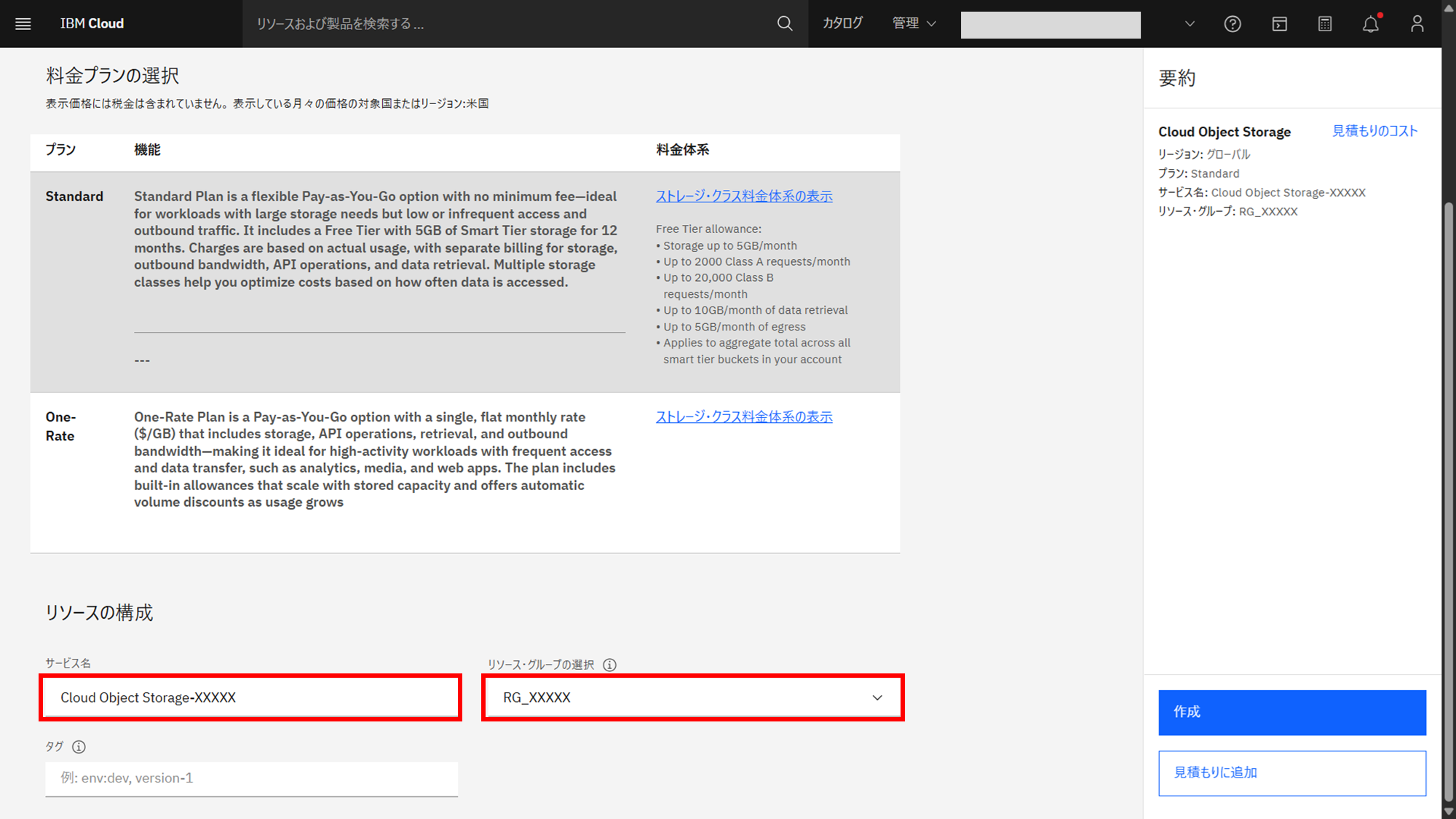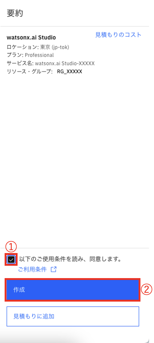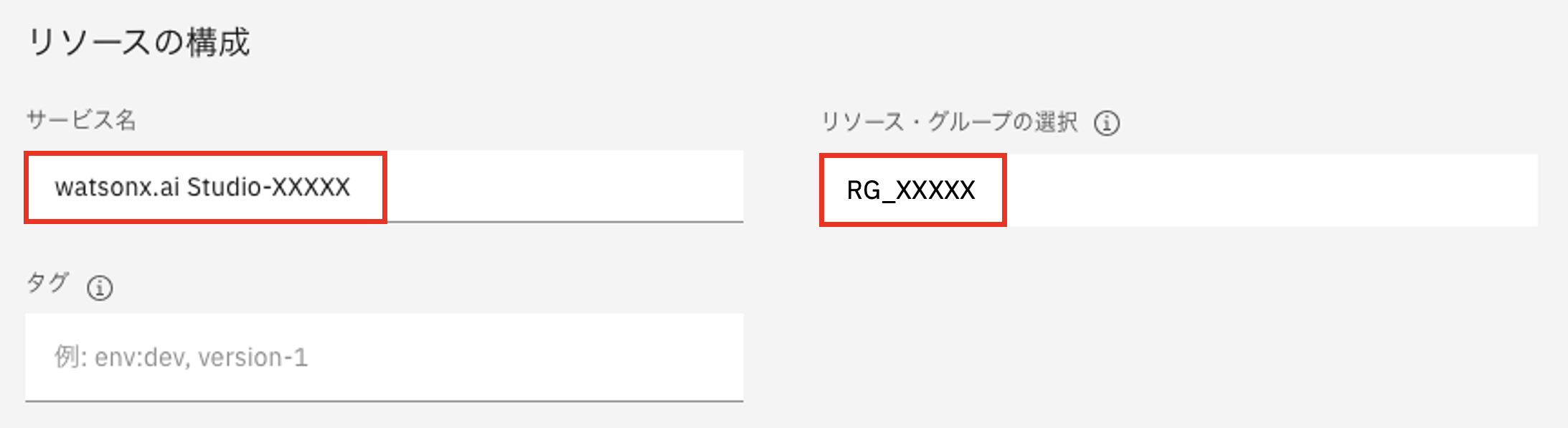 - リソースの構成 セクションで、サービス名に watsonx.ai Studio-XXXXX を入力(XXXXXは任意の文字列)、リソース・グループの選択で前で作成した RG_XXXXX を選択する。タグは空欄でOK