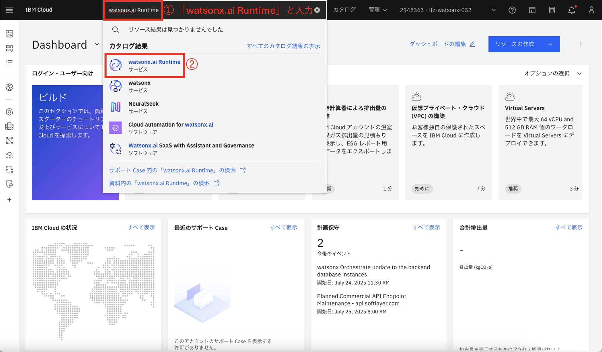 - 表示された入力欄に watsonx.ai Runtime と入力し、数秒後に表示される カタログ結果 欄の watsonx.ai Runtime をクリックする