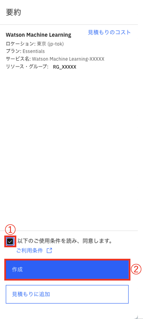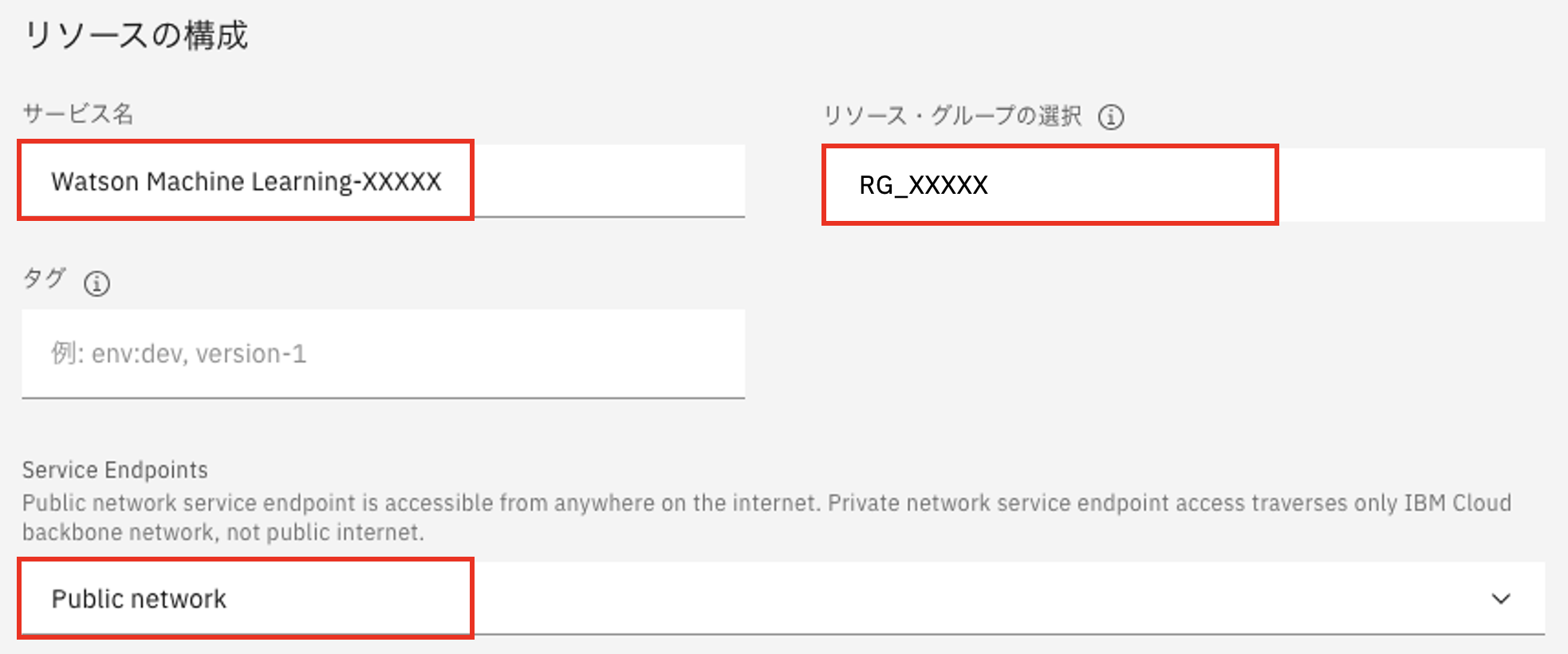 - リソースの構成 セクションで、サービス名に Watson Machine Learning-XXXXX を入力(XXXXXは任意の文字列)、リソース・グループの選択で前で作成した RG_XXXXX を選択する。タグは空欄でOK