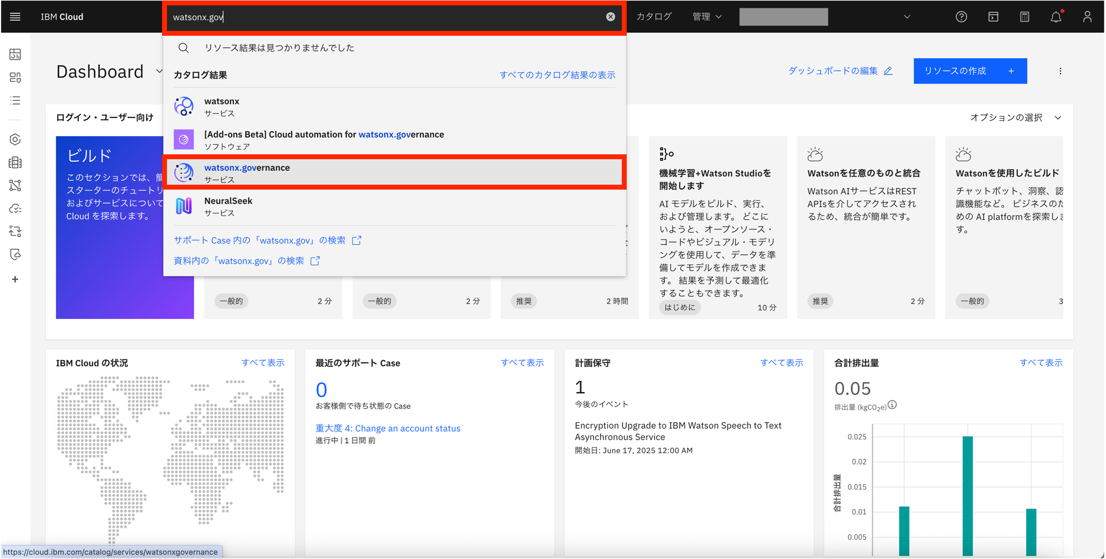 - 表示された入力欄に watsonx.gov と入力し、数秒後に表示される カタログ結果 欄の watsonx.governance をクリックする